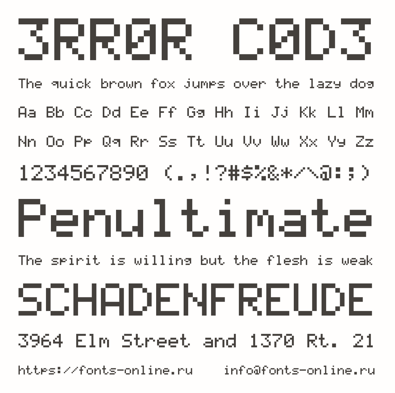 Шрифт 3RR0R C0D3. Гарнитура содержит 1 файл и поддерживает 51 язык. Лицензия GNU LGPL 3.0. Можно использовать в коммерческой и не коммерческой деятельности.