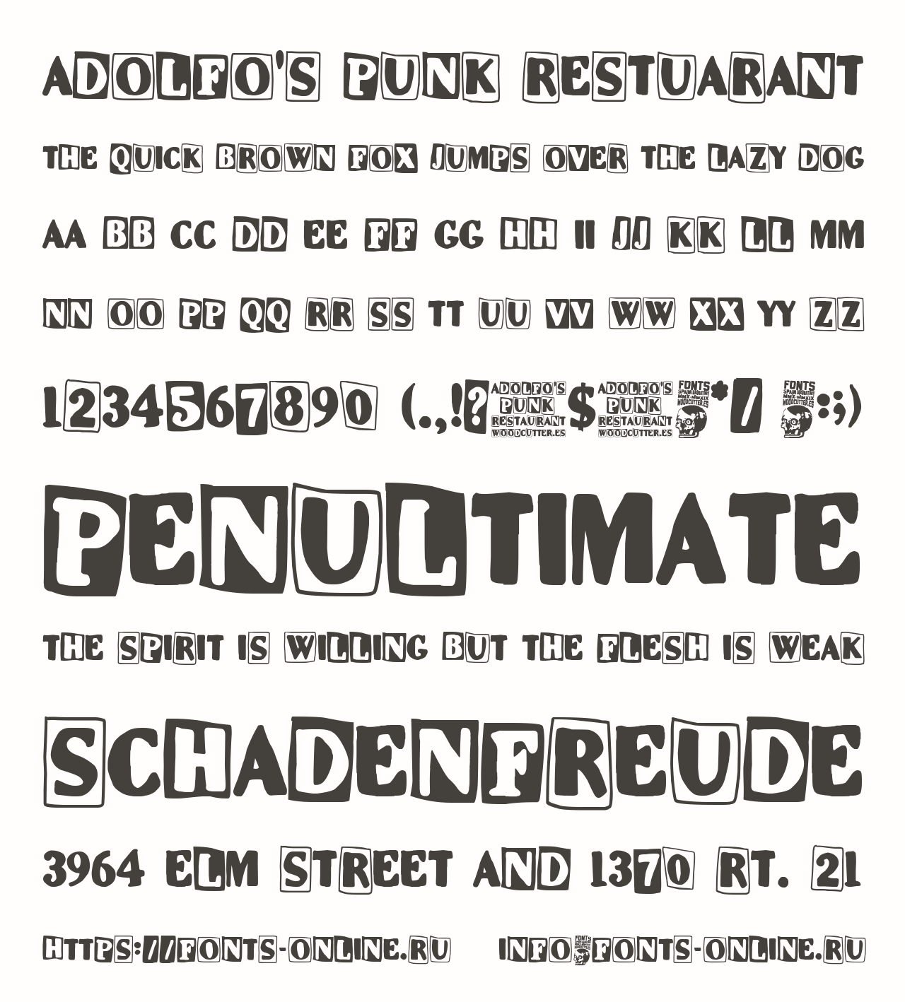 Шрифт Adolfo's Punk Restuarant. Гарнитура содержит 1 файл и поддерживает 37 языков. Можно использовать в не коммерческой деятельности. Разработка Adolfo's Punk Restuarant велась Woodcutter.