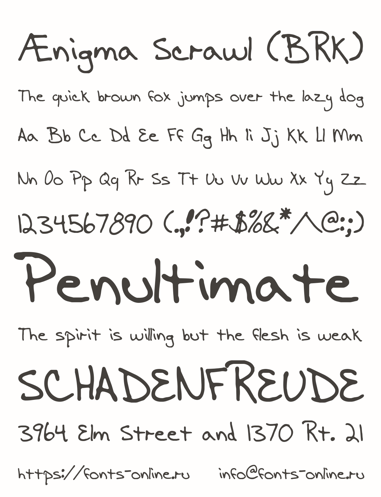 Шрифт Ænigma Scrawl (BRK). Гарнитура содержит 1 файл и поддерживает 12 языков. Можно использовать в коммерческой и не коммерческой деятельности.
