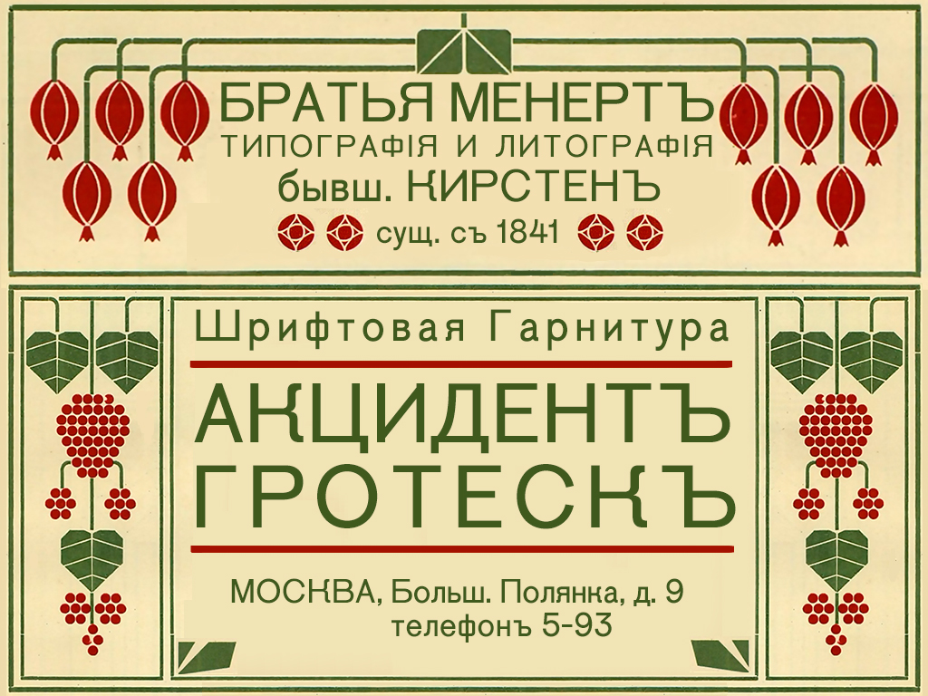 Digital vers. from book "Samples of typo-lithography fonts br. Menert, former Kirsten in Moscow" 1915 Copyright (c) 2024 by Gophmann A.L.. All rights reserved.Лицензионные условия