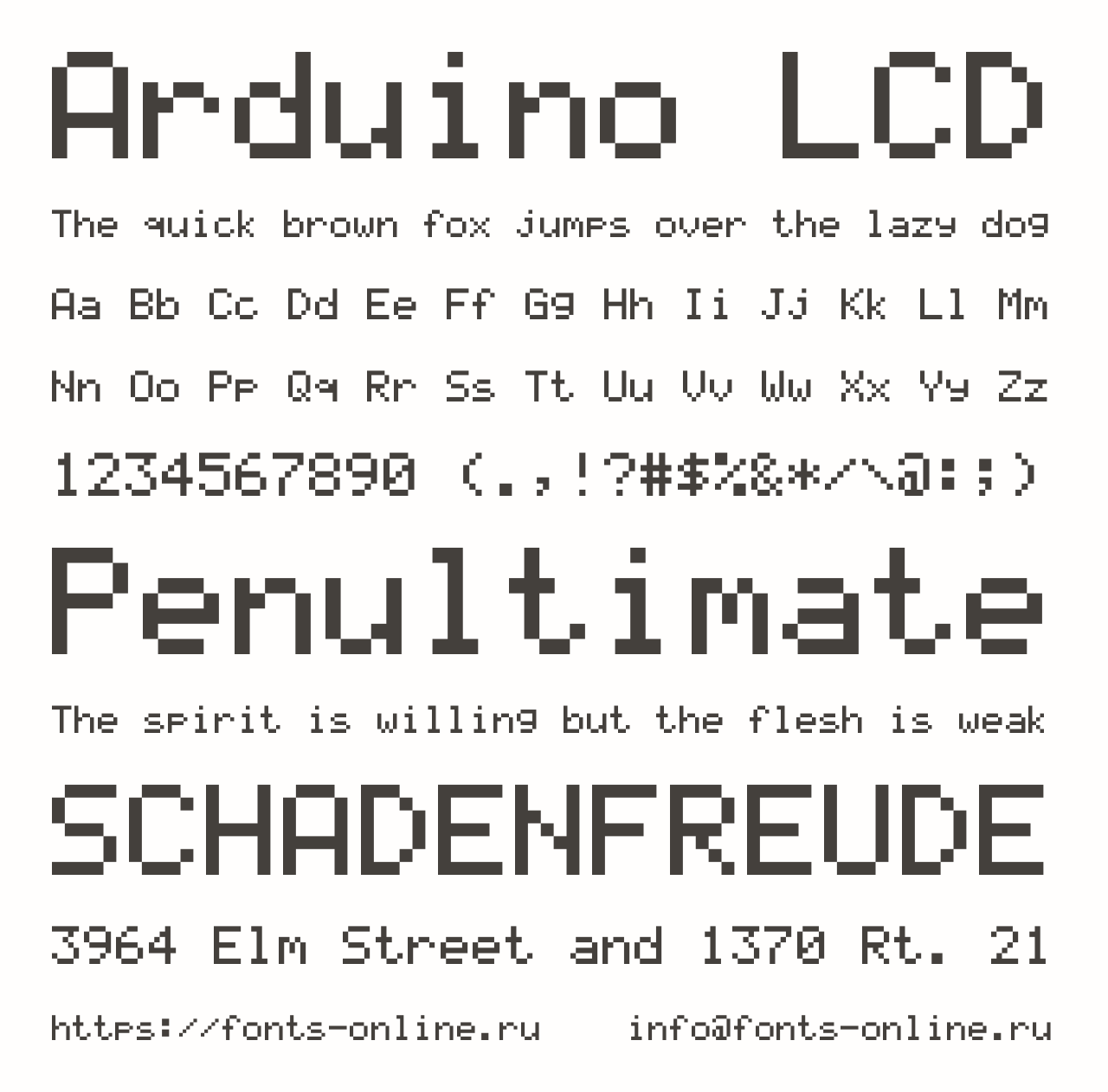 Шрифт Arduino LCD. Гарнитура содержит 1 файл и поддерживает 42 языка. Лицензия GNU GPL 3.0. Можно использовать в коммерческой и не коммерческой деятельности.