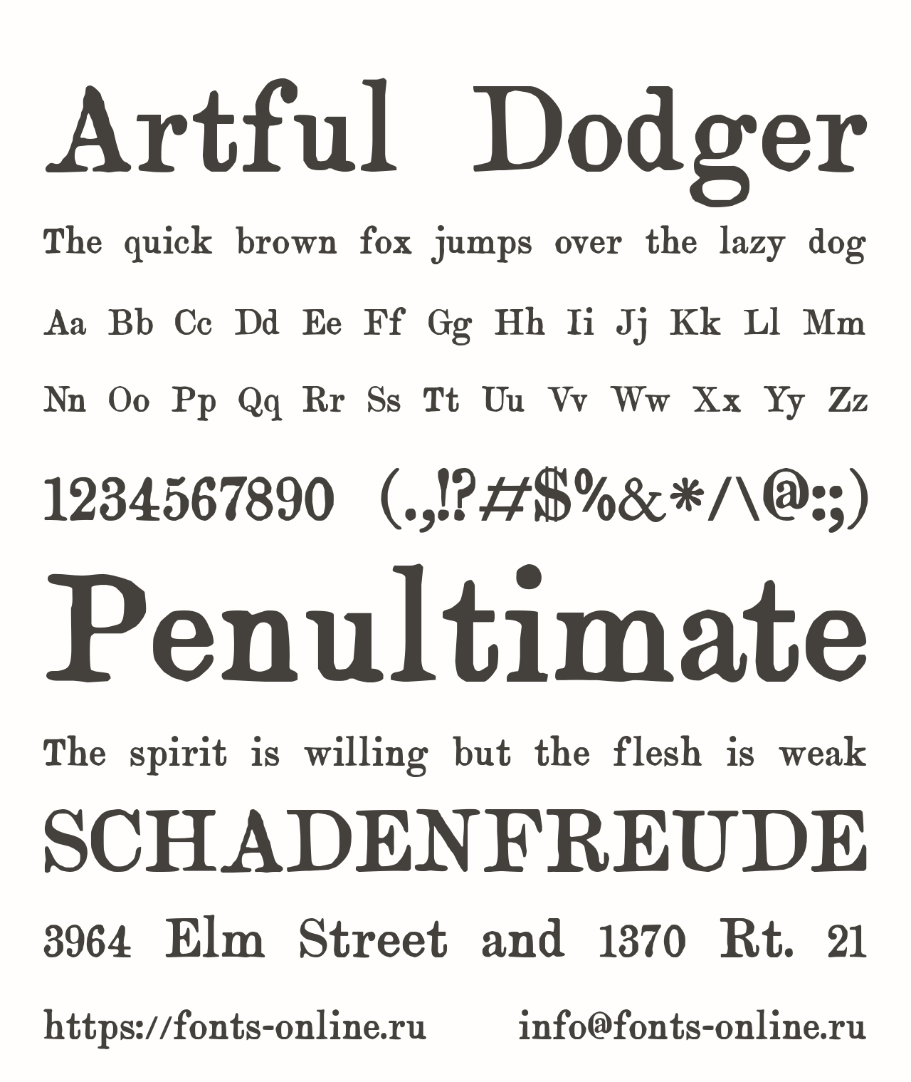 Artful Dodger PinterestFacebookTwitter Скачать Artful Dodger Тестировать Artful Dodger Сообщить об ошибке Шрифт Artful Dodger. Гарнитура содержит 2 файла и поддерживает 58 языков. Изображения Copyright Copyright (c) 2012 by David Kerkhoff. All rights reserved. Дополнительная информация Категории Машинописные шрифты Тематические шрифты Шрифты для текста Шрифты с засечками Языки Албанский Английский Африкаанс Баскский Бретонский Букмол Валлийский Венгерский Волапюк Галисийский Гренландский Датский Западнофризский Зулу Индонезийский Ирландский Исландский Испанский Итальянский Каталанский Кечуанский Кикуйю Корнский Латышский Литовский Луганда Люксембургский Малагасийский Мальтийский Мэнский Немецкий Нидерландский Новонорвежский Оромо Польский Португальский Романшский Руанда Рунди Санго Северносаамский Северный ндебеле Словацкий Словенский Сомалийский Суахили Турецкий Узбекский Фарерский Финский Французский Хорватский Чешский Шведский Шона Шотландский Эсперанто Эстонский