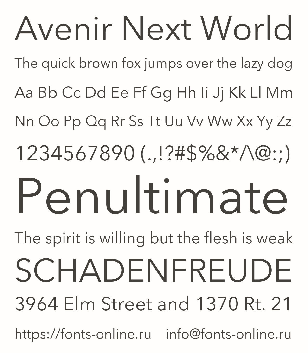 Avenir Next World PinterestFacebookTwitter Скачать Avenir Next World Тестировать Avenir Next World Сообщить об ошибке Шрифт Avenir Next World. Гарнитура содержит 20 файлов и поддерживает 76 языков. Copyright Copyright © 2020-2021 Monotype GmbH. All rights reserved. Дополнительная информация Категории Современные шрифты Шрифты без засечек Шрифты для заголовков Шрифты для текста Языки Азербайджанский Албанский Английский Армянский Африкаанс Баскский Белорусский Болгарский Боснийский Бретонский Букмол Валлийский Венгерский Волапюк Вьетнамский Галисийский Гренландский Греческий Грузинский Датский Западнофризский Зулу Иврит Идиш Индонезийский Ирландский Исландский Испанский Итальянский Каталанский Кечуанский Кикуйю Корнский Латышский Литовский Луганда Люксембургский Македонский Малагасийский Мальтийский Мэнский Немецкий Нидерландский Новонорвежский Оромо Осетинский Польский Португальский Романшский Руанда Румынский Рунди Русский Санго Северносаамский Северный ндебеле Сербский Словацкий Словенский Сомалийский Суахили Тайский Турецкий Узбекский Украинский Фарерский Финский Французский Хорватский Чеченский Чешский Шведский Шона Шотландский Эсперанто Эстонский