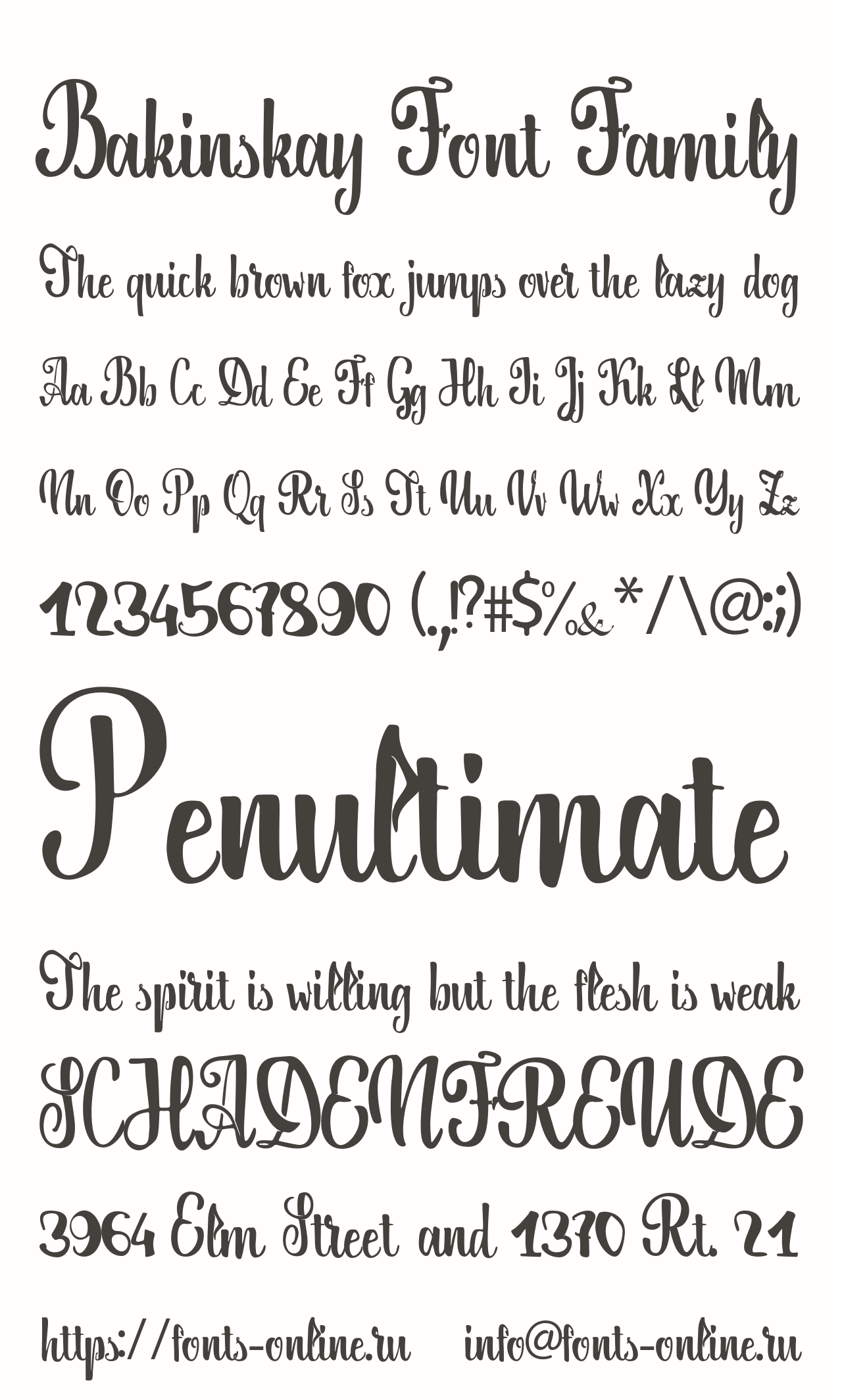 Bakinskay Font Family PinterestFacebookTwitter Скачать Bakinskay Font Family Тестировать Bakinskay Font Family Сообщить об ошибке Шрифт Bakinskay Font Family. Гарнитура содержит 4 файла и поддерживает 15 языков. Изображения Copyright Copyright (c) 2017 by Sergey Bykov. All rights reserved. Дополнительная информация Категории Винтажные шрифты Декоративные шрифты Дизайнерские шрифты Красивые шрифты Художественные шрифты Шрифты с завитушками День святого Валентина Праздничные шрифты Новогодние и рождественские шрифты Свадебные шрифты Шрифты для дня рождения Рукописные шрифты Каллиграфические шрифты Сказочные шрифты Тематические шрифты Языки Английский Болгарский Зулу Индонезийский Корнский Оромо Руанда Рунди Русский Северный ндебеле Сомалийский Суахили Узбекский Чеченский Шона