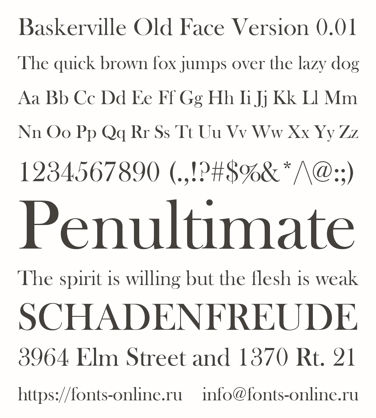 Шрифт Baskerville Old Face Version 0.01. Гарнитура содержит 1 файл и поддерживает 41 язык.