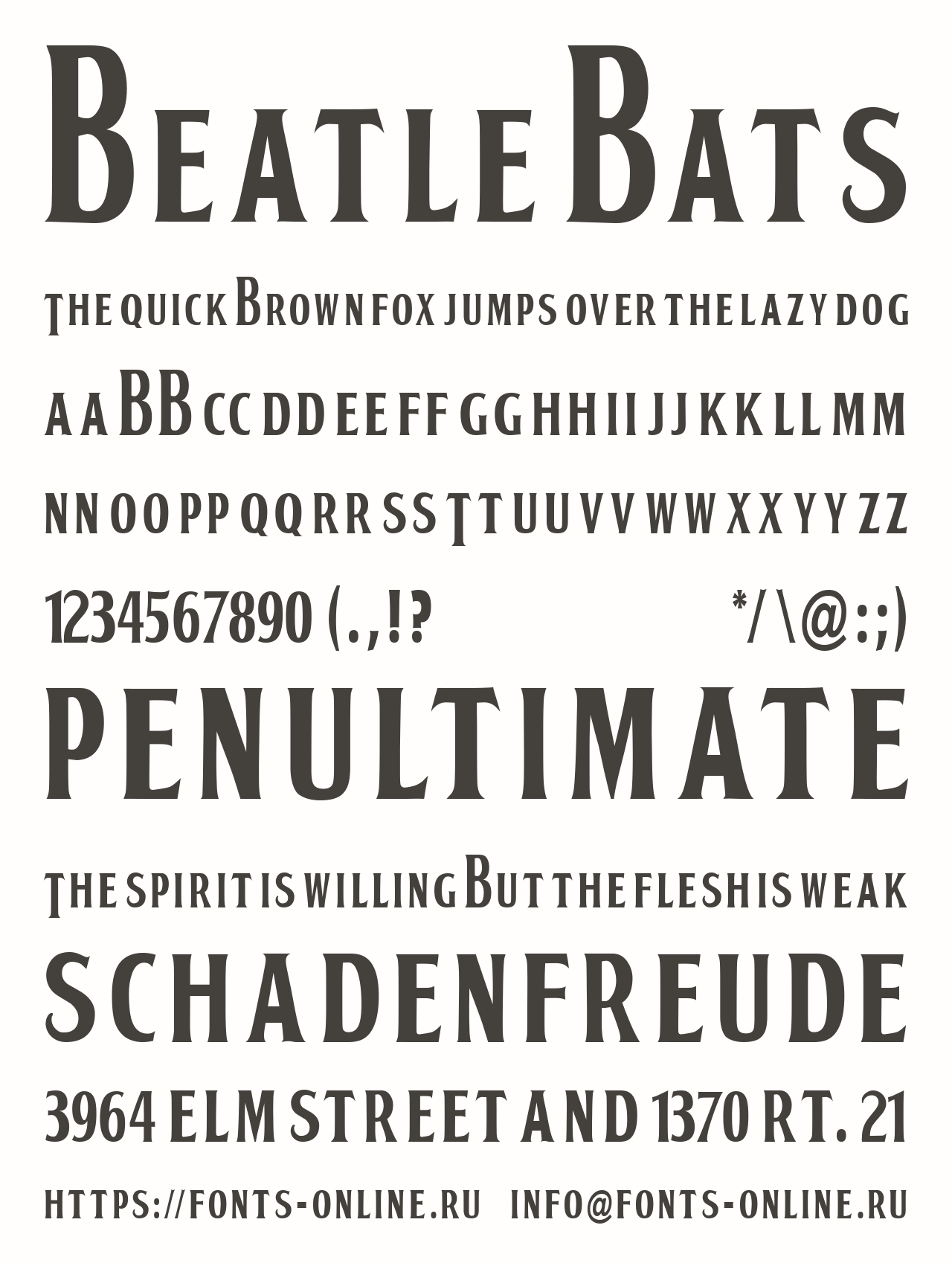 Beatle Bats PinterestFacebookTwitter Скачать Beatle Bats Тестировать Beatle Bats Сообщить об ошибке Шрифт Beatle Bats. Гарнитура содержит 3 файла и поддерживает 58 языков. Изображения Copyright © Anders Kvernberg Дополнительная информация Категории Тематические шрифты Брендовые шрифты Шрифты для заголовков Шрифты для текста Шрифты с засечками Языки Албанский Английский Африкаанс Баскский Бретонский Букмол Валлийский Венгерский Волапюк Галисийский Гренландский Датский Западнофризский Зулу Индонезийский Ирландский Исландский Испанский Итальянский Каталанский Кечуанский Кикуйю Корнский Латышский Литовский Луганда Люксембургский Малагасийский Мальтийский Мэнский Немецкий Нидерландский Новонорвежский Оромо Польский Португальский Романшский Руанда Рунди Санго Северносаамский Северный ндебеле Словацкий Словенский Сомалийский Суахили Турецкий Узбекский Фарерский Финский Французский Хорватский Чешский Шведский Шона Шотландский Эсперанто Эстонский