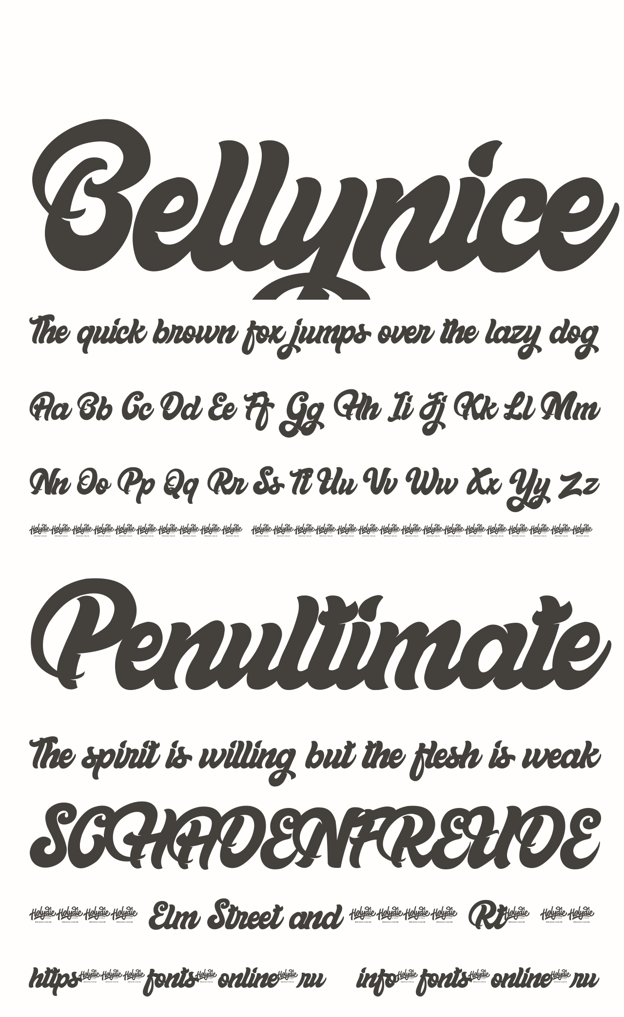 Шрифт Bellynice. Гарнитура содержит 1 файл и поддерживает 12 языков. Можно использовать в не коммерческой деятельности. Разработка Bellynice велась Holydie Studio.