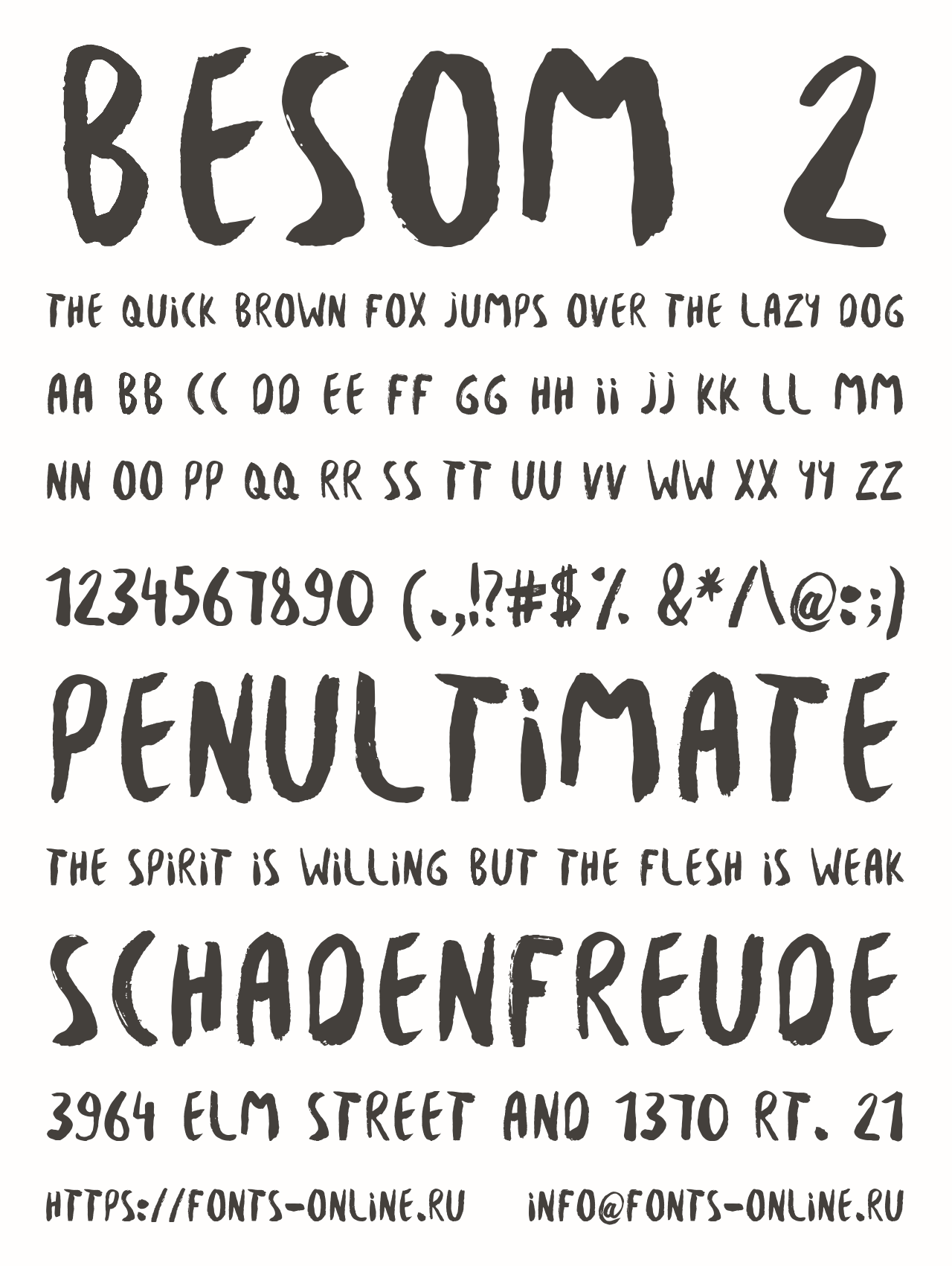 Besom 2 PinterestFacebookTwitter Скачать Besom 2 Тестировать Besom 2 Сообщить об ошибке Шрифт Besom 2. Гарнитура содержит 5 файлов и поддерживает 25 языков. Изображения Дополнительная информация Категории Рукописные шрифты Скетч шрифты Школьные шрифты Шрифты кисти Языки Английский Болгарский Волапюк Зулу Индонезийский Ирландский Кикуйю Корнский Латышский Луганда Люксембургский Немецкий Оромо Руанда Рунди Русский Северный ндебеле Словенский Сомалийский Суахили Узбекский Финский Чеченский Шона Эстонский