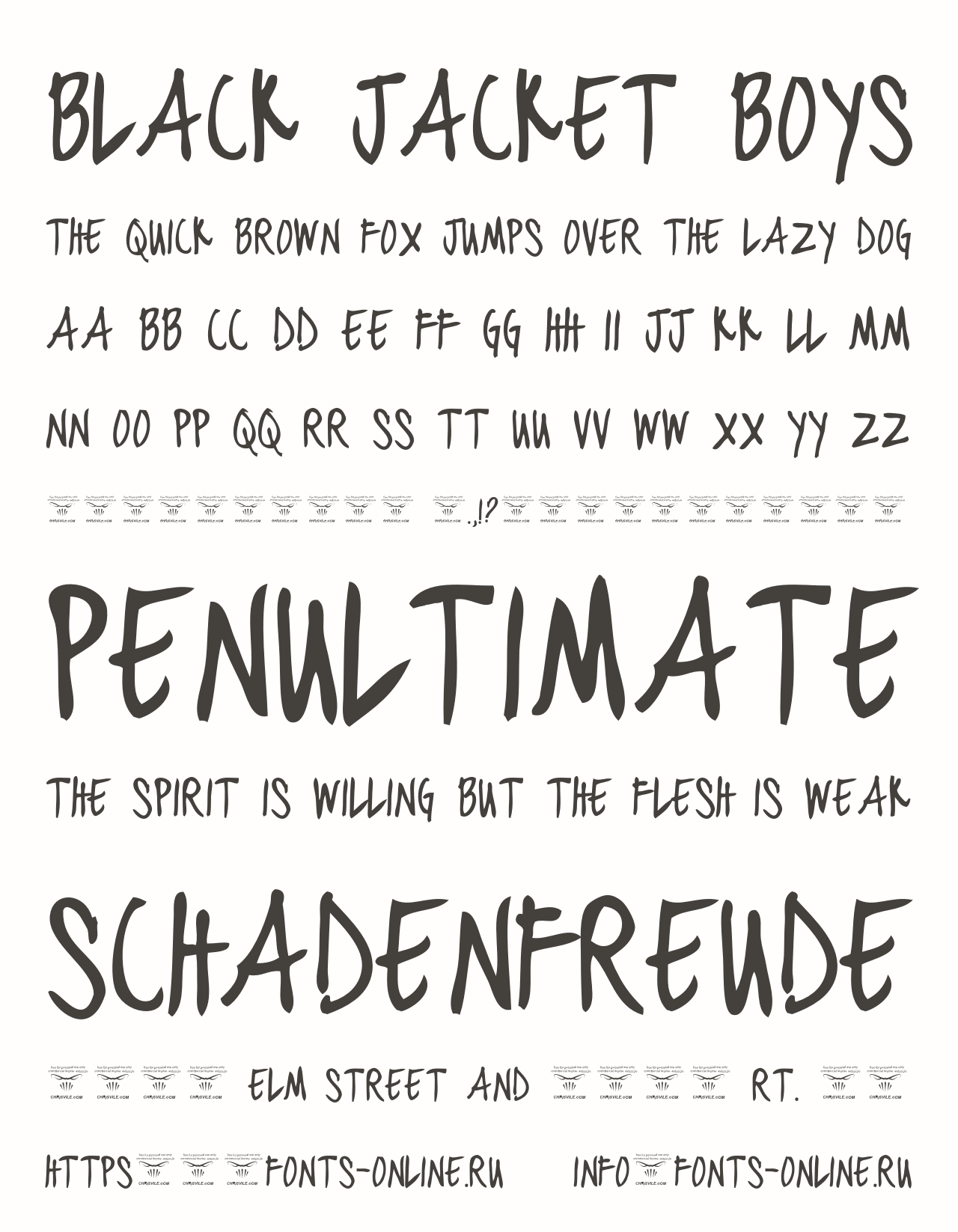 Шрифт black jacket boys. Гарнитура содержит 10 файлов и поддерживает 12 языков. Можно использовать в не коммерческой деятельности. Разработка black jacket boys велась Font Monger.