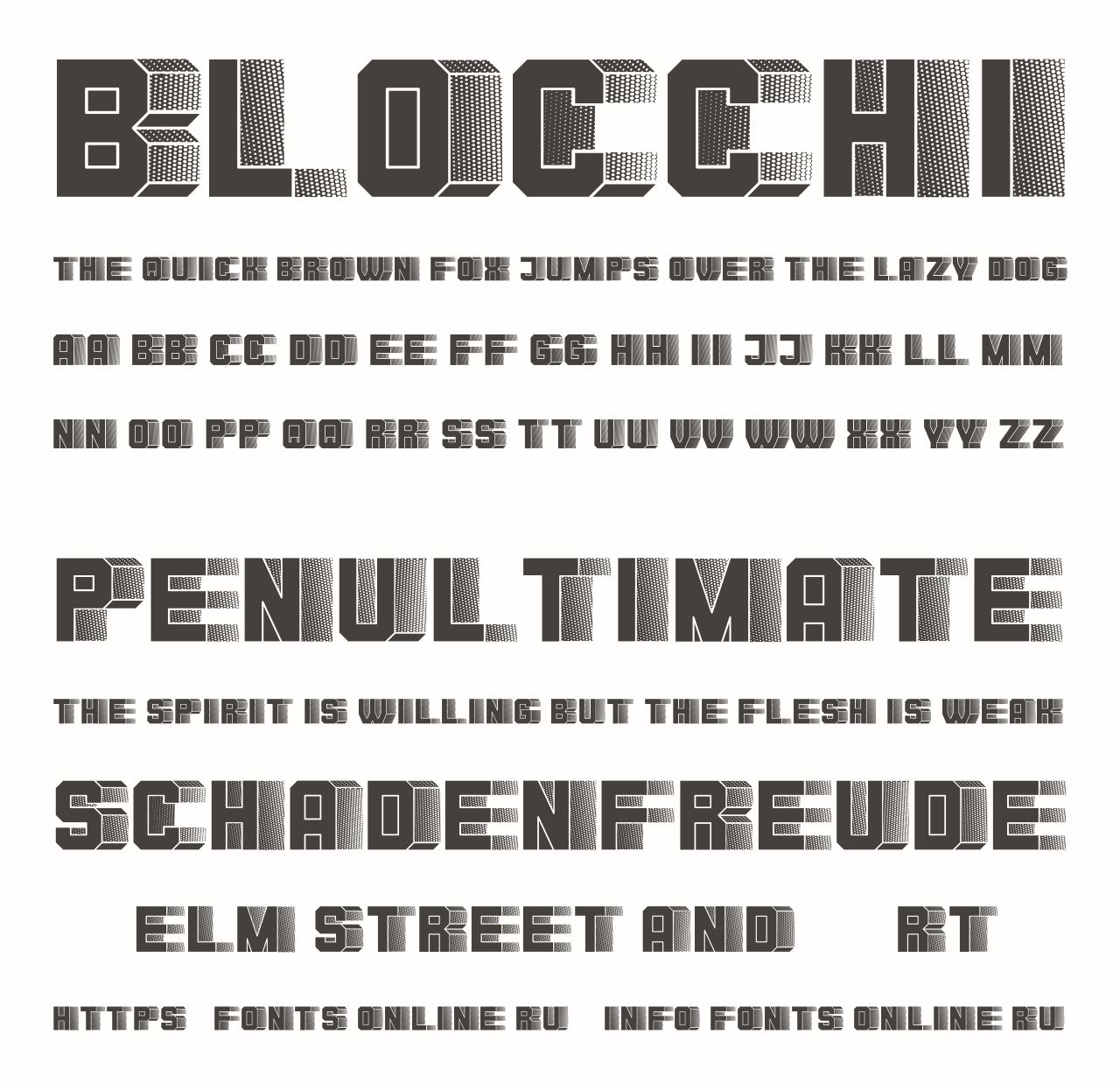 Шрифт Blocchi. Гарнитура содержит 4 файла и поддерживает 12 языков. Можно использовать в не коммерческой деятельности. Разработка Blocchi велась Vladimir Nikolic.