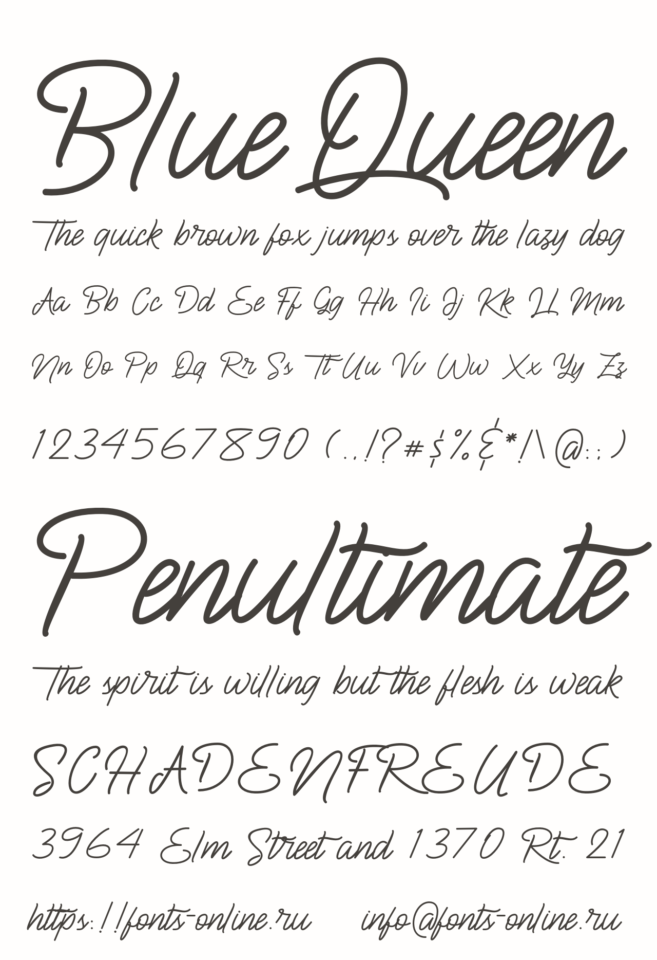 Шрифт BlueQueen. Гарнитура содержит 2 файла и поддерживает 40 языков. Можно использовать в не коммерческой деятельности. Разработка BlueQueen велась selawetype.