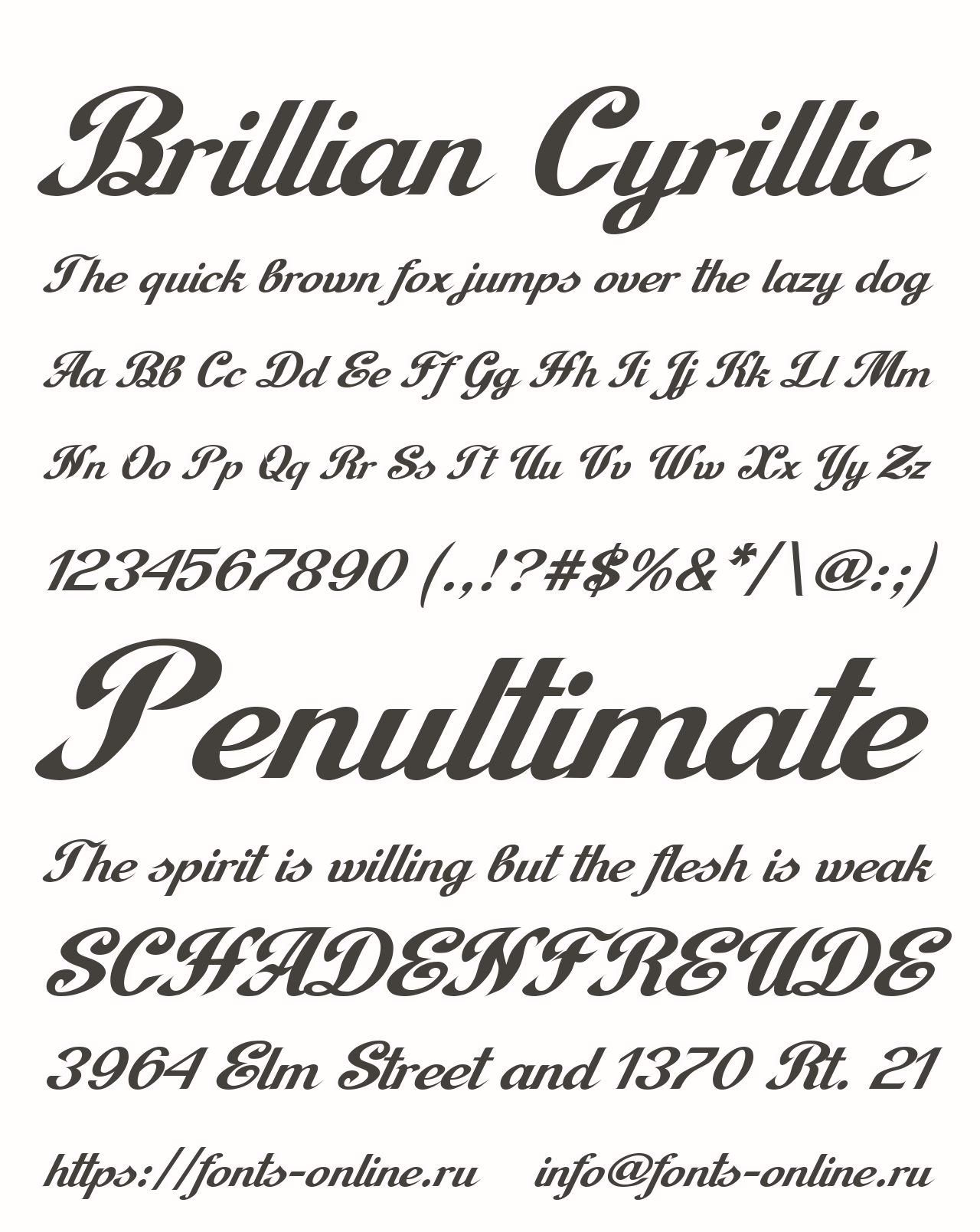 Brillian Cyrillic PinterestFacebookTwitter Скачать Brillian Cyrillic Тестировать Brillian Cyrillic Сообщить об ошибке Шрифт Brillian Cyrillic. Гарнитура содержит 12 файлов и поддерживает 21 язык. Изображения Copyright Typeface © FontEx 2011. All Rights Reserved Дополнительная информация Категории Дизайнерские шрифты Декоративные шрифты Красивые шрифты Художественные шрифты Рукописные шрифты Языки Азербайджанский Английский Белорусский Болгарский Боснийский Зулу Индонезийский Корнский Македонский Оромо Осетинский Руанда Рунди Русский Северный ндебеле Сербский Сомалийский Суахили Узбекский Чеченский Шона