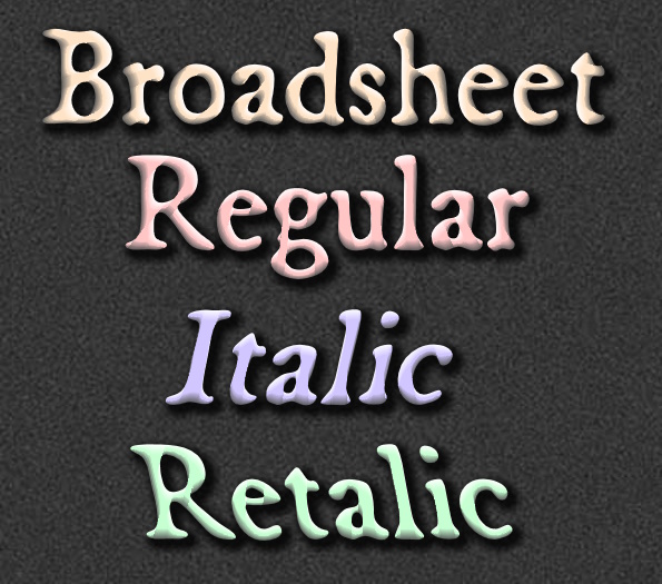 Broadsheet Font Family PinterestFacebookTwitter Скачать Broadsheet Font Family Тестировать Broadsheet Font Family Сообщить об ошибке Шрифт Broadsheet Font Family. Гарнитура содержит 3 файла и поддерживает 42 языка. Изображения Copyright © Copyright Broadsheet is copyright (c) 2000, 2003, 2011-12 by Brian Willson/Three Islands Press (3IP). All rights reserved worldwide., FFDec v.23.0.0. Дополнительная информация Категории Машинописные шрифты Тематические шрифты Шрифты для текста Шрифты с засечками Языки Албанский Английский Африкаанс Баскский Болгарский Бретонский Букмол Волапюк Галисийский Датский Зулу Индонезийский Ирландский Исландский Испанский Итальянский Каталанский Кечуанский Корнский Люксембургский Малагасийский Мэнский Немецкий Нидерландский Новонорвежский Оромо Португальский Романшский Руанда Рунди Русский Санго Северный ндебеле Сомалийский Суахили Узбекский Фарерский Французский Чеченский Шведский Шона Шотландский