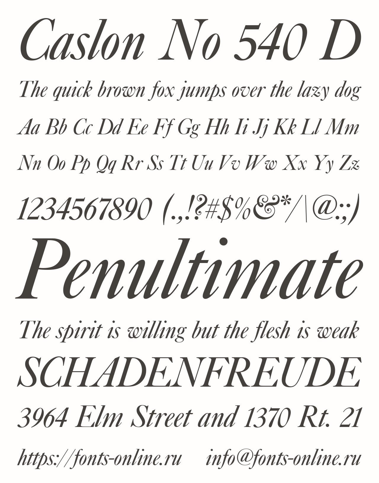 Caslon No 540 D PinterestFacebookTwitter Скачать Caslon No 540 D Тестировать Caslon No 540 D Сообщить об ошибке Шрифт Caslon No 540 D. Гарнитура содержит 1 файл и поддерживает 69 языков. Copyright Copyright 2010 by (URW)++ Design & Development GmbH Дополнительная информация Категории Шрифты для текста Шрифты с засечками Языки Азербайджанский Албанский Английский Африкаанс Баскский Белорусский Болгарский Боснийский Бретонский Букмол Валлийский Венгерский Волапюк Галисийский Гренландский Греческий Датский Западнофризский Зулу Индонезийский Ирландский Исландский Испанский Итальянский Каталанский Кечуанский Кикуйю Корнский Латышский Литовский Луганда Люксембургский Македонский Малагасийский Мальтийский Мэнский Немецкий Нидерландский Новонорвежский Оромо Польский Португальский Романшский Руанда Румынский Рунди Русский Санго Северносаамский Северный ндебеле Сербский Словацкий Словенский Сомалийский Суахили Турецкий Узбекский Украинский Фарерский Финский Французский Хорватский Чеченский Чешский Шведский Шона Шотландский Эсперанто Эстонский