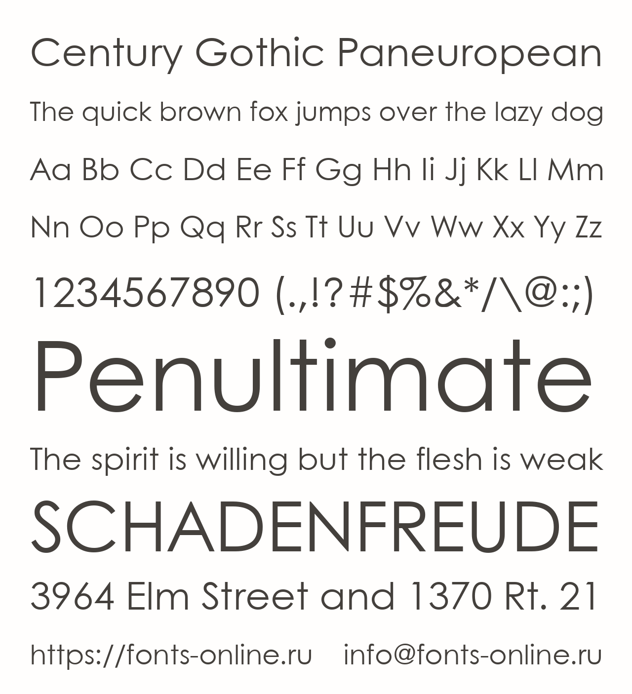 Century Gothic Paneuropean PinterestFacebookTwitter Скачать Century Gothic Paneuropean Тестировать Century Gothic Paneuropean Сообщить об ошибке Шрифт Century Gothic Paneuropean. Гарнитура содержит 14 файлов и поддерживает 69 языков. Copyright Copyright © 1990-2020 The Monotype Corporation. All rights reserved. Дополнительная информация Категории Шрифты без засечек Шрифты для заголовков Шрифты для текста Языки Азербайджанский Албанский Английский Африкаанс Баскский Белорусский Болгарский Боснийский Бретонский Букмол Валлийский Венгерский Волапюк Галисийский Гренландский Греческий Датский Западнофризский Зулу Индонезийский Ирландский Исландский Испанский Итальянский Каталанский Кечуанский Кикуйю Корнский Латышский Литовский Луганда Люксембургский Македонский Малагасийский Мальтийский Мэнский Немецкий Нидерландский Новонорвежский Оромо Польский Португальский Романшский Руанда Румынский Рунди Русский Санго Северносаамский Северный ндебеле Сербский Словацкий Словенский Сомалийский Суахили Турецкий Узбекский Украинский Фарерский Финский Французский Хорватский Чеченский Чешский Шведский Шона Шотландский Эсперанто Эстонский