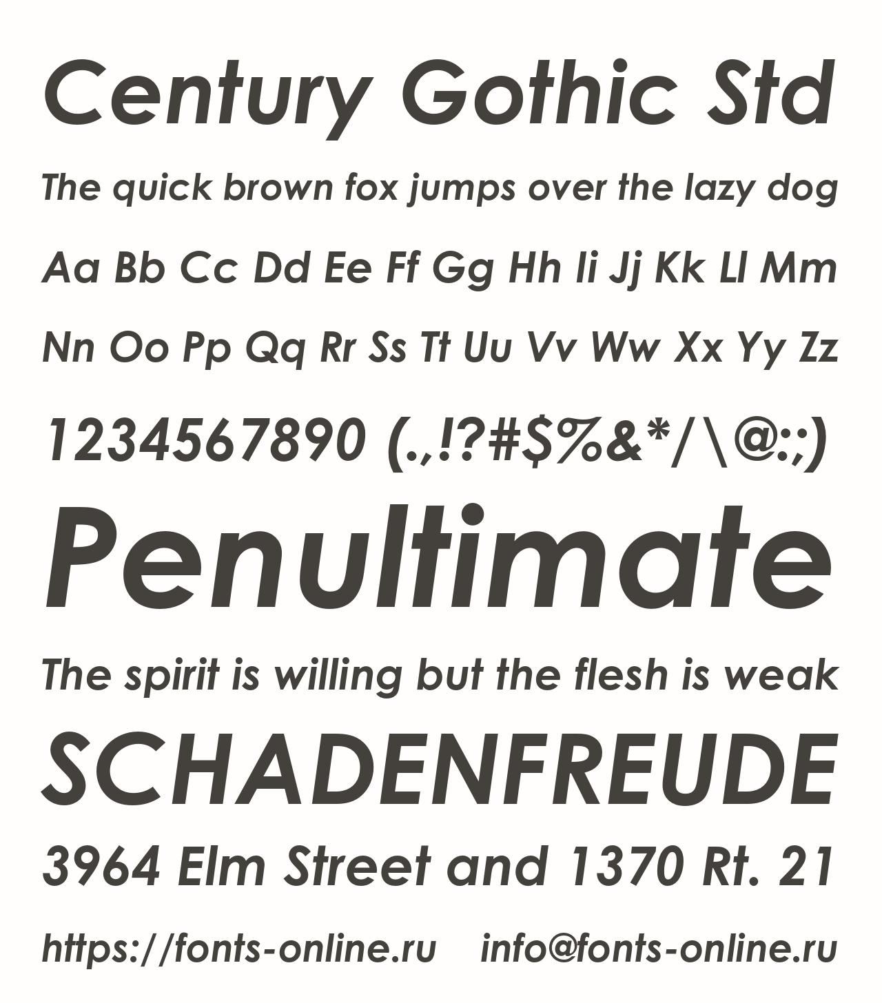 Century Gothic Std PinterestFacebookTwitter Скачать Century Gothic Std Тестировать Century Gothic Std Сообщить об ошибке Шрифт Century Gothic Std. Гарнитура содержит 4 файла и поддерживает 41 язык. Описание Use this font if you can! Copyright Digitized data copyright 1991 The Monotype Corporation. All rights reserved. Дополнительная информация Категории Шрифты без засечек Шрифты для заголовков Шрифты для текста Языки Албанский Английский Африкаанс Баскский Бретонский Букмол Волапюк Галисийский Датский Зулу Индонезийский Ирландский Исландский Испанский Итальянский Каталанский Кечуанский Корнский Люксембургский Малагасийский Мэнский Немецкий Нидерландский Новонорвежский Оромо Португальский Романшский Руанда Рунди Санго Северный ндебеле Сомалийский Суахили Узбекский Фарерский Финский Французский Шведский Шона Шотландский Эстонский