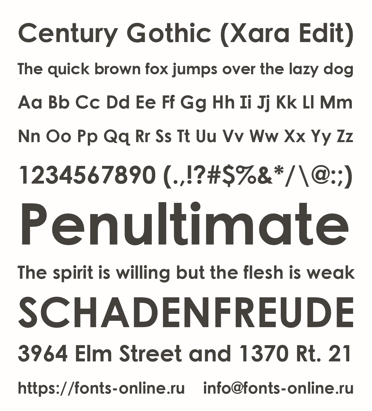 Century Gothic (Xara Edit) PinterestFacebookTwitter Скачать Century Gothic (Xara Edit) Тестировать Century Gothic (Xara Edit) Сообщить об ошибке Шрифт Century Gothic (Xara Edit). Гарнитура содержит 1 файл и поддерживает 66 языков. Copyright Typeface © The Monotype Corporation plc. Data © The Monotype Corporation plc / Type Solutions Inc. 1990-91 All Rights Reserved Дополнительная информация Категории Тематические шрифты Альтернативные шрифты Шрифты без засечек Шрифты для заголовков Языки Албанский Английский Африкаанс Баскский Белорусский Болгарский Боснийский Бретонский Букмол Валлийский Венгерский Волапюк Галисийский Гренландский Греческий Датский Западнофризский Зулу Индонезийский Ирландский Исландский Испанский Итальянский Каталанский Кечуанский Кикуйю Корнский Латышский Литовский Луганда Люксембургский Македонский Малагасийский Мальтийский Мэнский Немецкий Нидерландский Новонорвежский Оромо Польский Португальский Романшский Руанда Рунди Русский Санго Северносаамский Северный ндебеле Сербский Словацкий Словенский Сомалийский Суахили Турецкий Узбекский Фарерский Финский Французский Хорватский Чеченский Чешский Шведский Шона Шотландский Эсперанто Эстонский