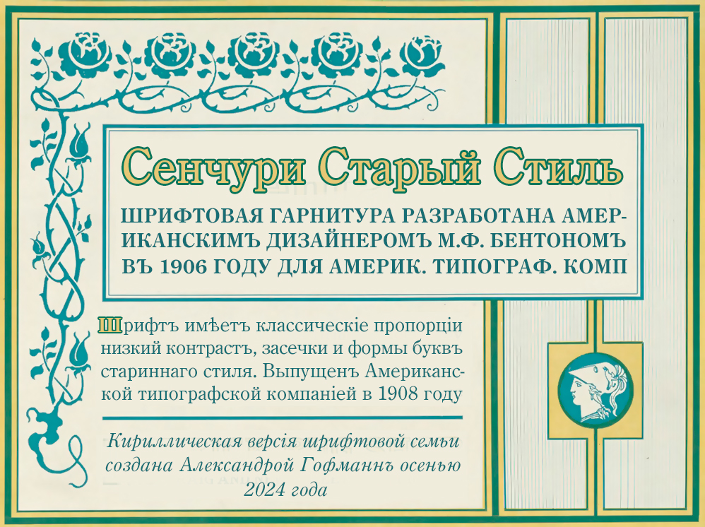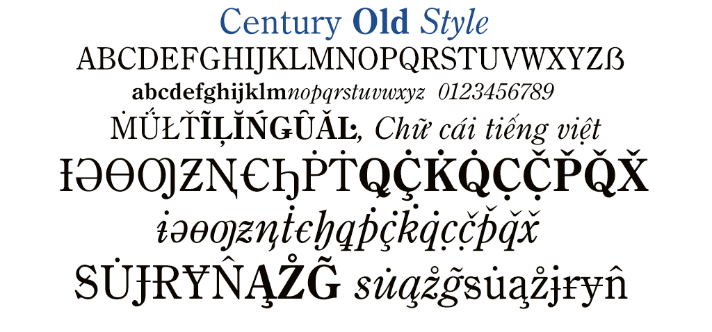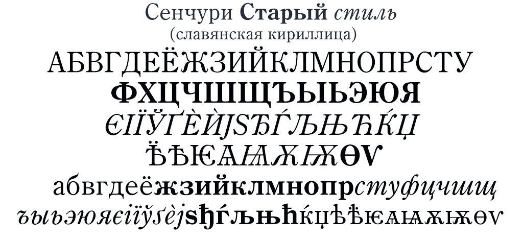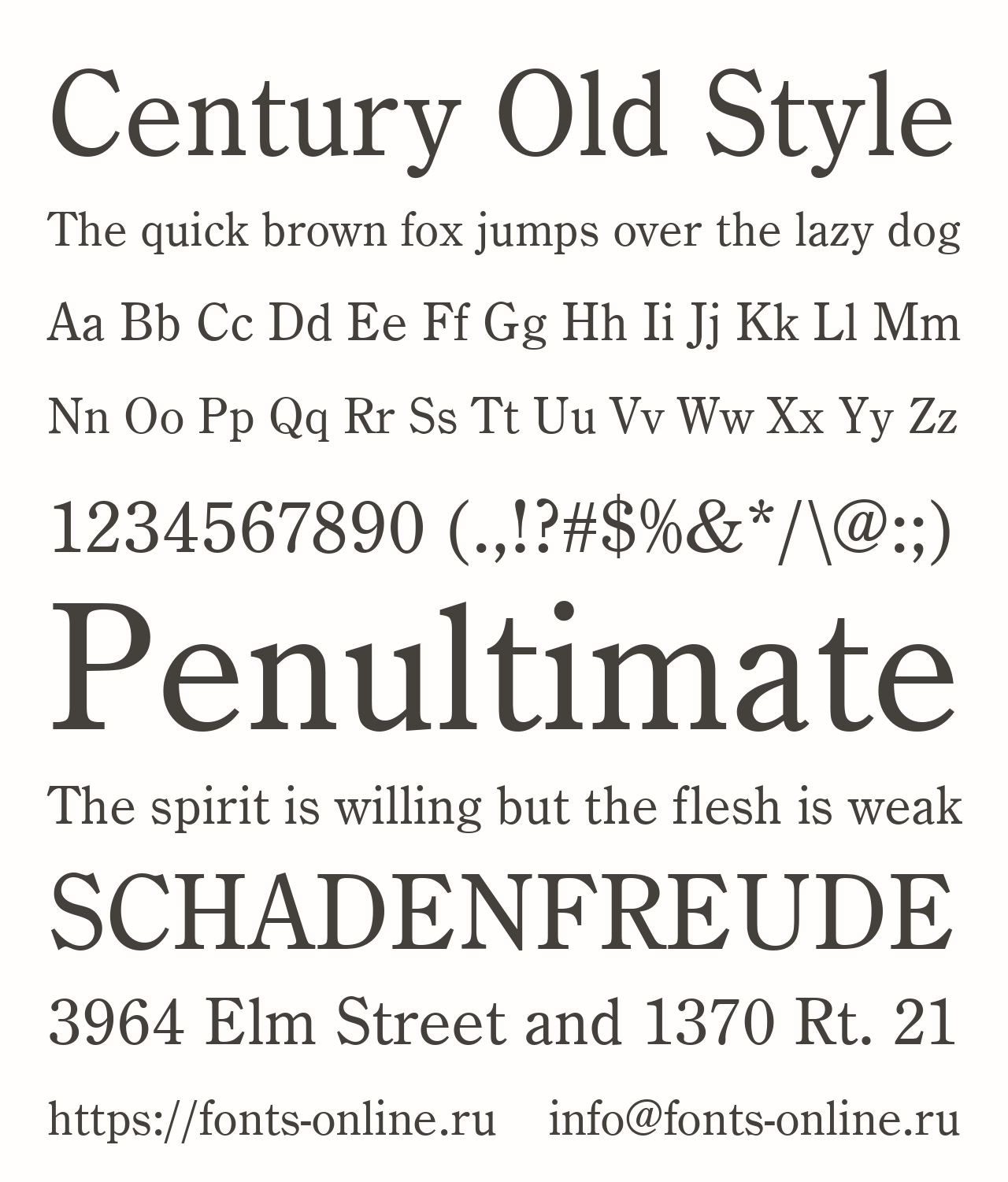 Шрифт Century Old Style. Гарнитура содержит 3 файла и поддерживает 74 языка. Можно использовать в не коммерческой деятельности. Разработка Century Old Style велась Alexandra Gophmann.