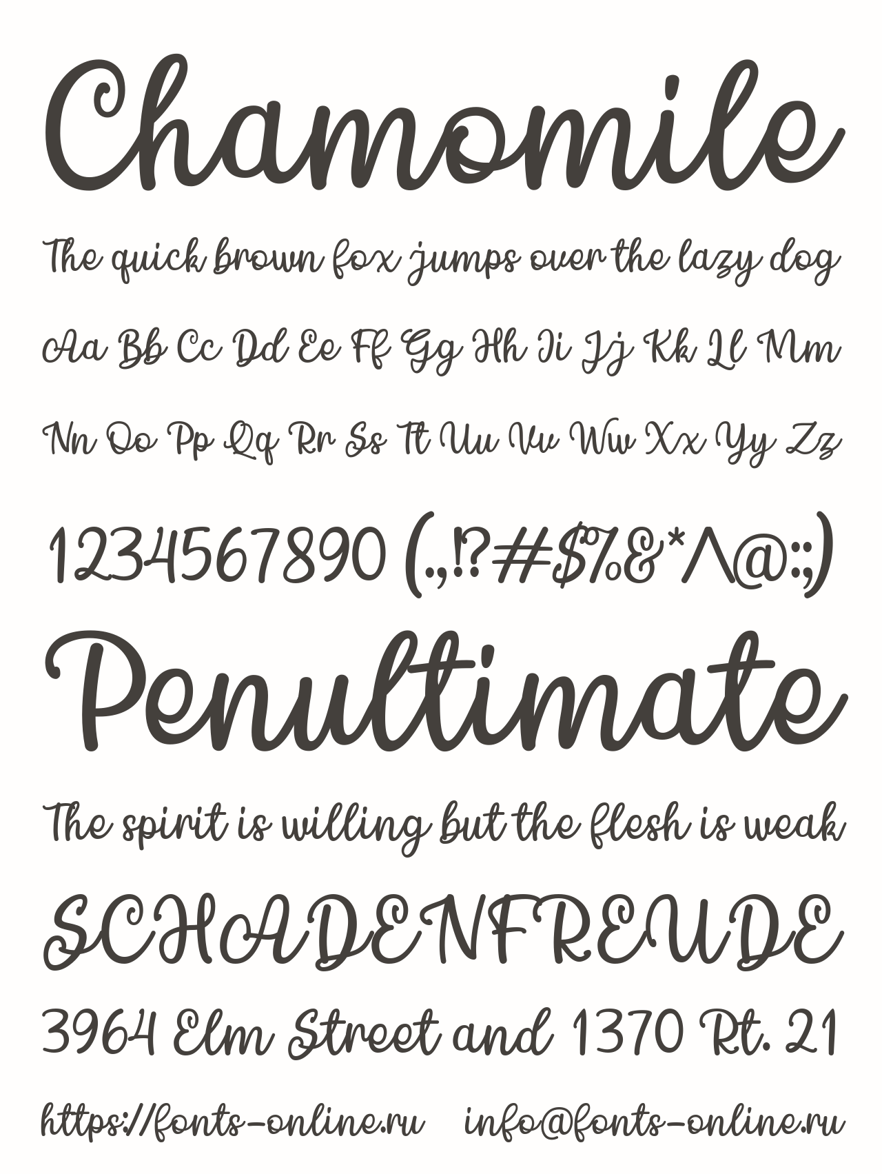 Шрифт Chamomile. Гарнитура содержит 1 файл и поддерживает 37 языков. Можно использовать в не коммерческой деятельности. Разработка Chamomile велась 7NTypes.