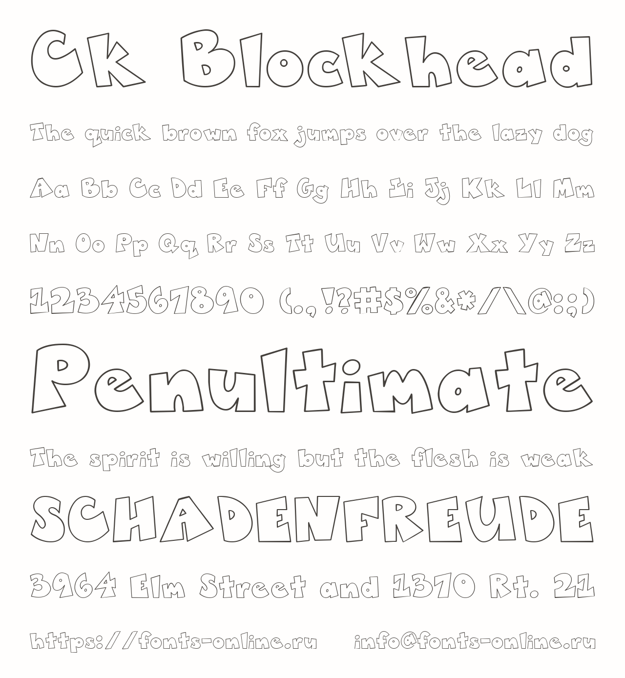 Ck Blockhead PinterestFacebookTwitter Скачать Ck Blockhead Тестировать Ck Blockhead Сообщить об ошибке Шрифт Ck Blockhead. Гарнитура содержит 1 файл и поддерживает 33 языка. Copyright © Copyright 2002 Primedia, Inc. All right reserved. Дополнительная информация Категории Декоративные шрифты Комические шрифты Тематические шрифты Контурные шрифты Шрифты для заголовков Языки Албанский Английский Африкаанс Баскский Бретонский Волапюк Галисийский Зулу Индонезийский Ирландский Испанский Итальянский Каталанский Кечуанский Корнский Люксембургский Малагасийский Мэнский Немецкий Нидерландский Оромо Португальский Романшский Руанда Рунди Санго Северный ндебеле Сомалийский Суахили Узбекский Шведский Шона Шотландский