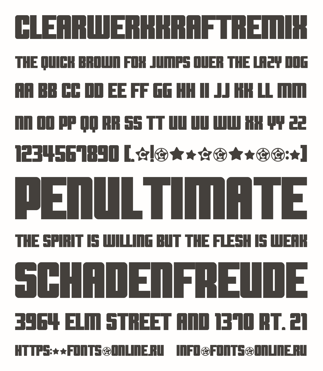 Шрифт Clearwerkkraftremix. Гарнитура содержит 1 файл и поддерживает 35 языков. Можно использовать в не коммерческой деятельности.