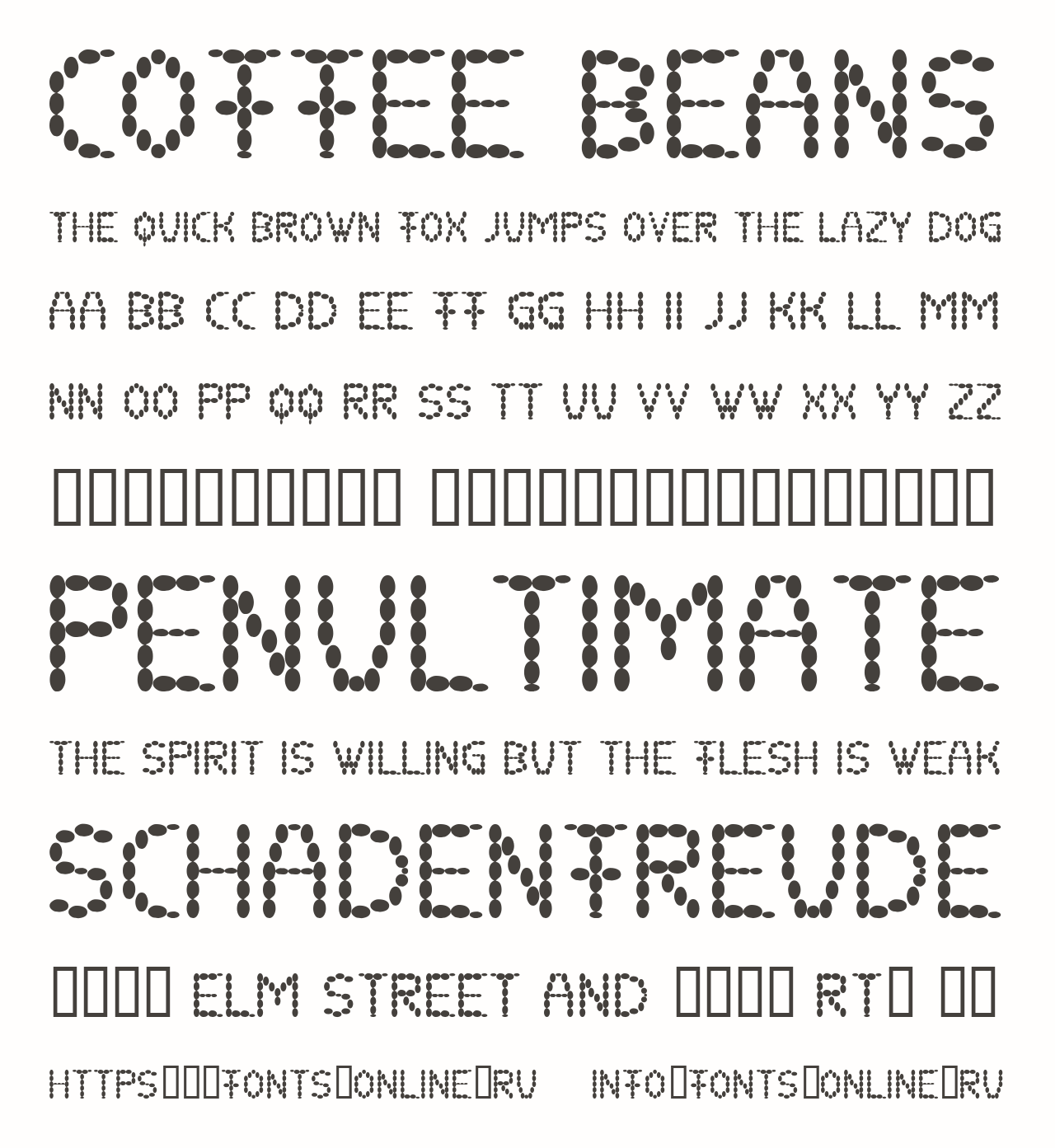 Шрифт coffee beans. Гарнитура содержит 1 файл и поддерживает 12 языков. Можно использовать в коммерческой и не коммерческой деятельности.