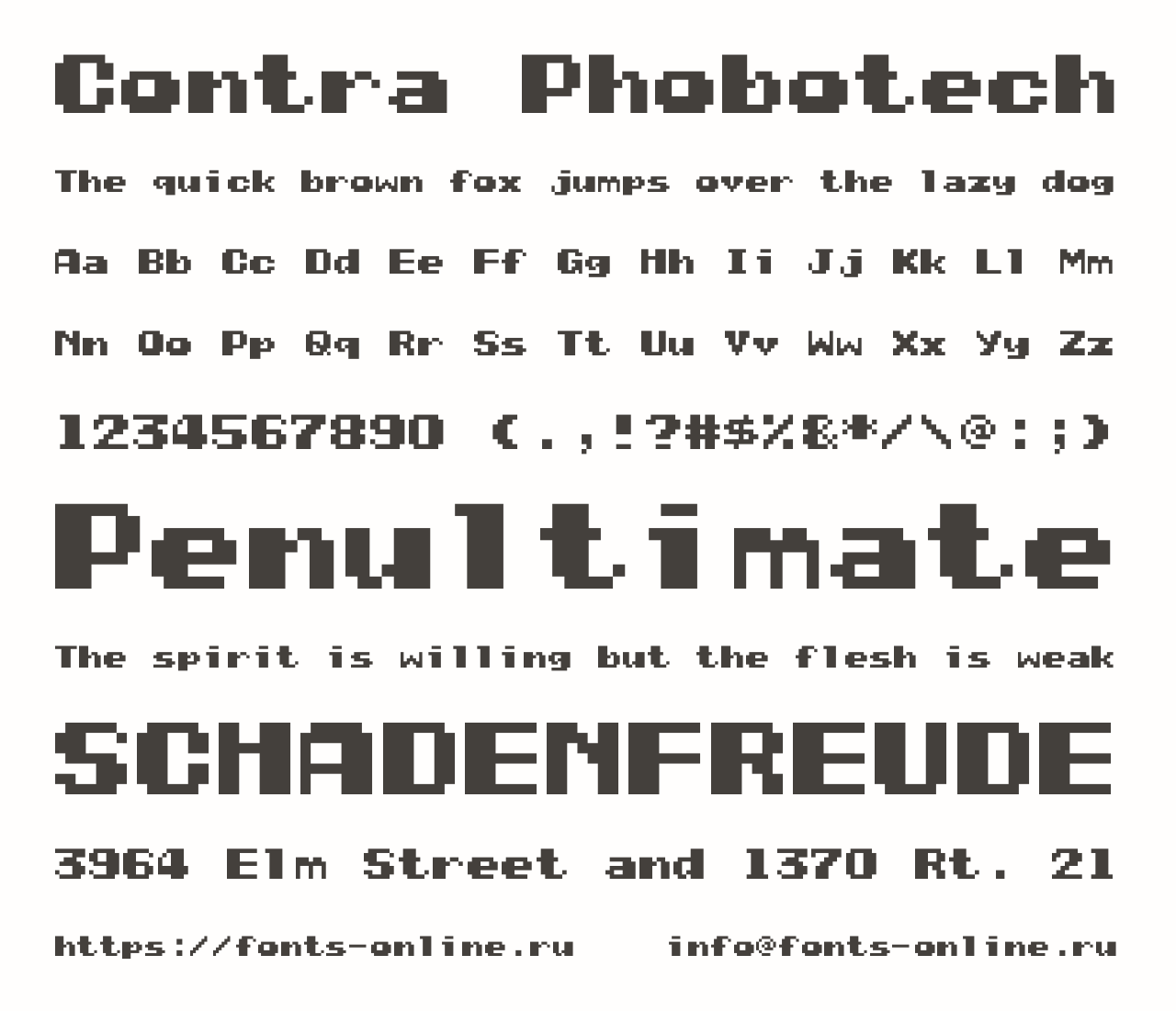 Шрифт Contra Phobotech. Гарнитура содержит 1 файл и поддерживает 49 языков. Лицензия GNU LGPL 3.0. Можно использовать в коммерческой и не коммерческой деятельности.