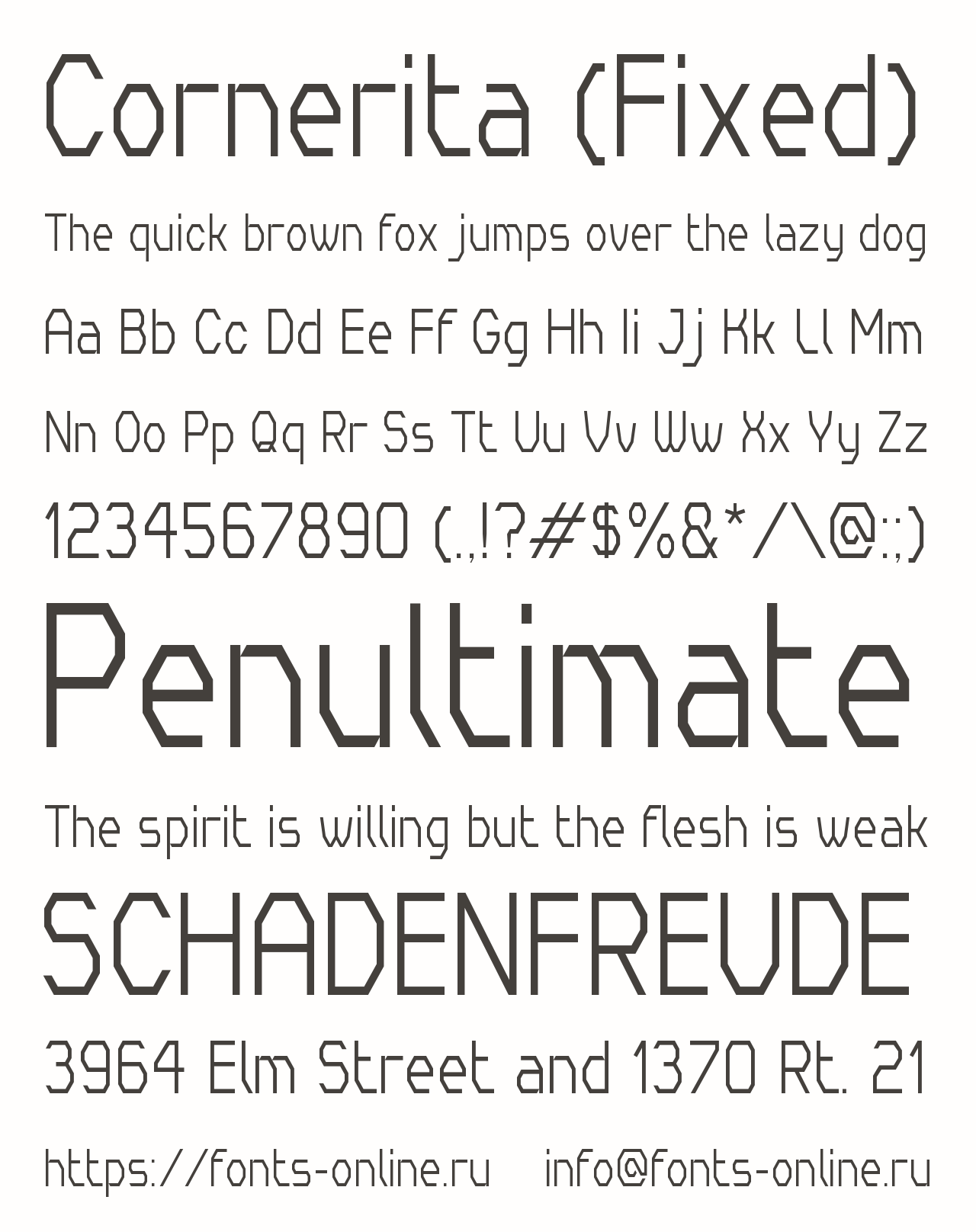 Cornerita (Fixed) вариативный шрифт. Гарнитура содержит 1 файл и поддерживает 39 языков. Лицензия SIL OFL 1.1. Можно использовать в коммерческой и не коммерческой деятельности. Разработка Cornerita (Fixed) велась Dimitri Antonov.