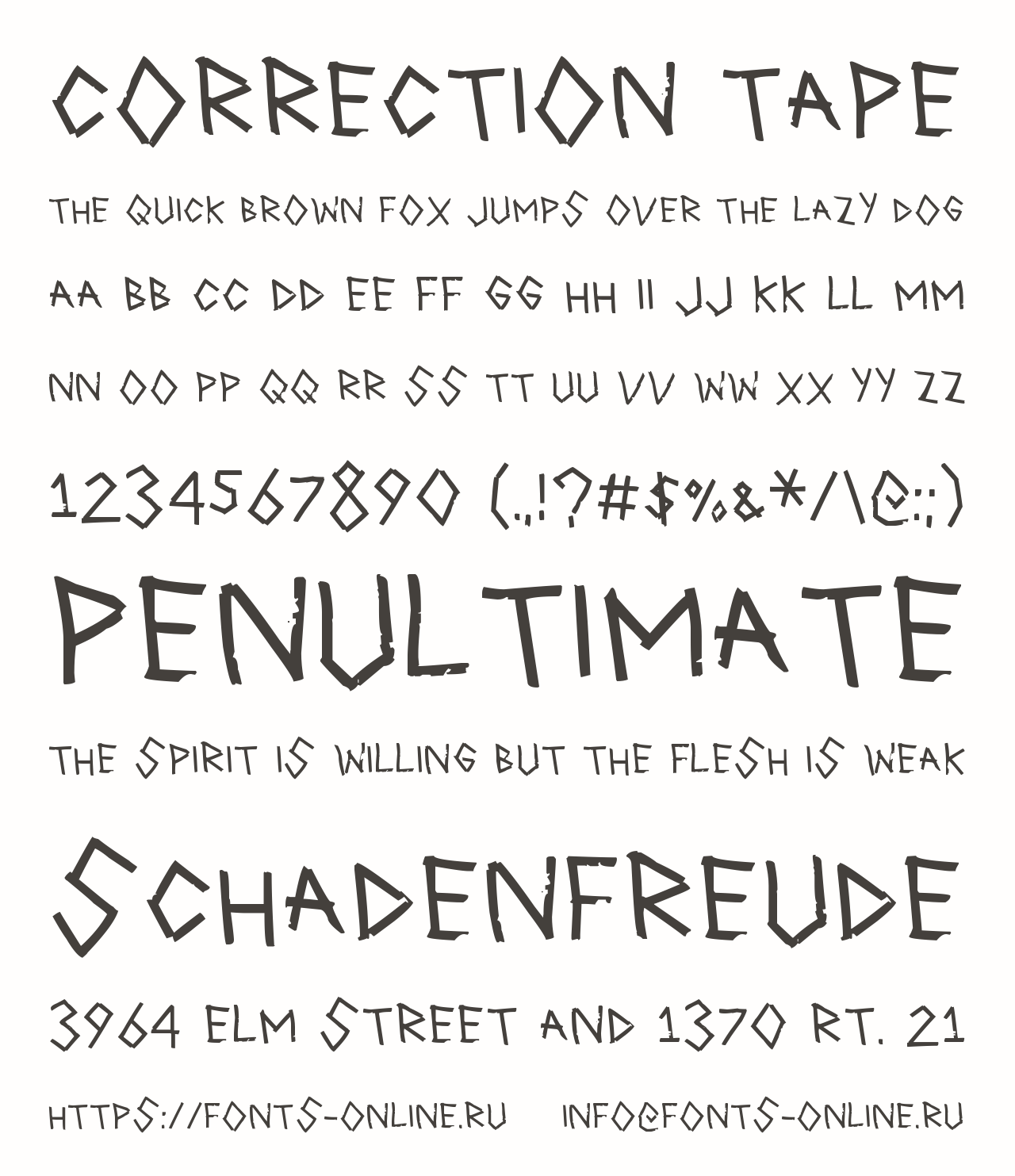 Шрифт Correction Tape. Гарнитура содержит 1 файл и поддерживает 66 языков. Лицензия SIL OFL 1.1. Можно использовать в коммерческой и не коммерческой деятельности. Разработка Correction Tape велась GGBotNet.