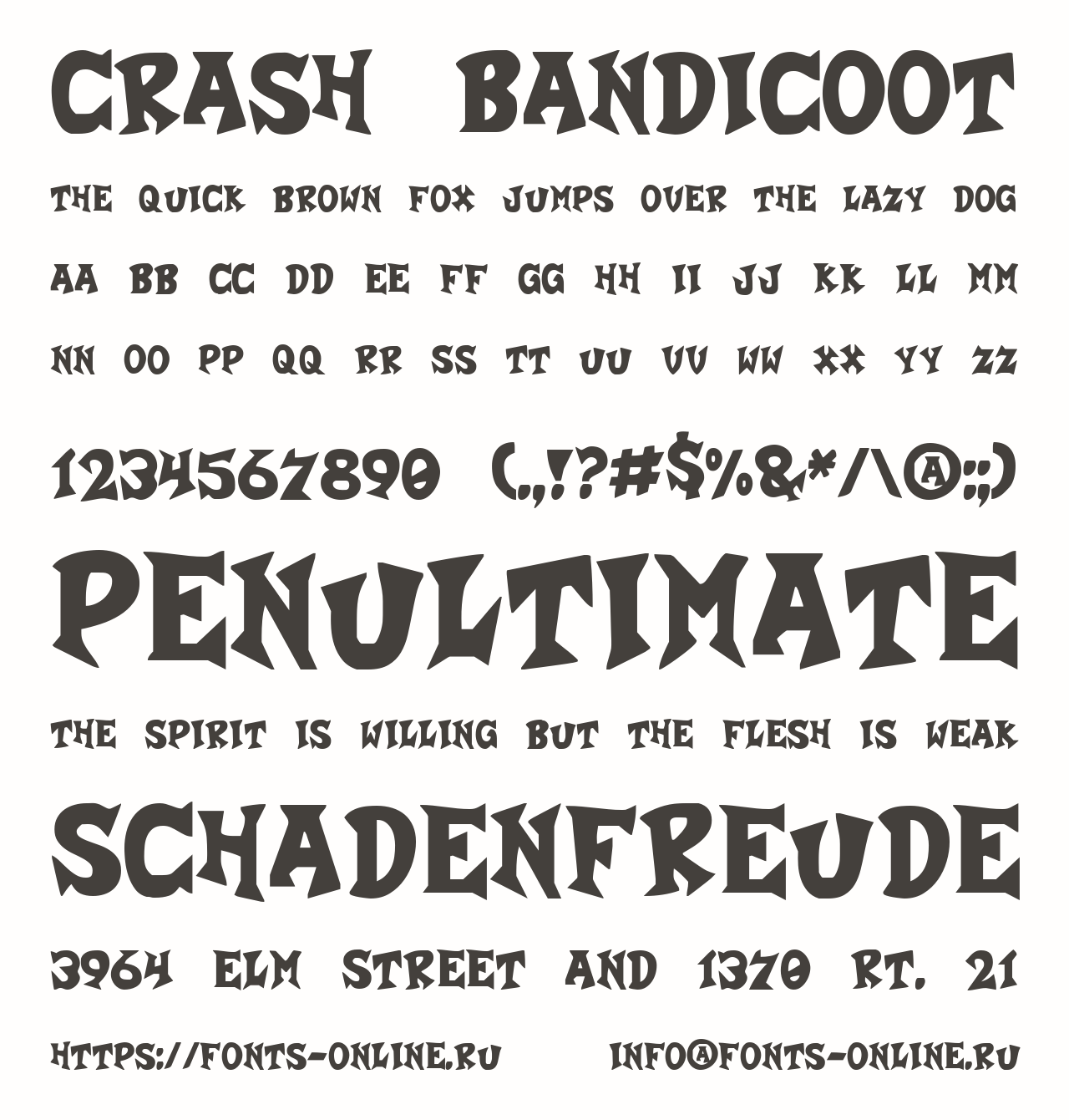 Crash Bandicoot PinterestFacebookTwitter Скачать Crash Bandicoot Тестировать Crash Bandicoot Сообщить об ошибке Шрифт Crash Bandicoot. Гарнитура содержит 1 файл и поддерживает 34 языка. Изображения Copyright PSXPLANET Дополнительная информация Категории Комические шрифты Тематические шрифты Шрифты из игр Языки Албанский Английский Африкаанс Баскский Болгарский Бретонский Галисийский Зулу Индонезийский Ирландский Испанский Итальянский Кечуанский Корнский Люксембургский Малагасийский Мэнский Немецкий Нидерландский Оромо Португальский Романшский Руанда Рунди Русский Санго Северный ндебеле Сомалийский Суахили Узбекский Чеченский Шведский Шона Шотландский