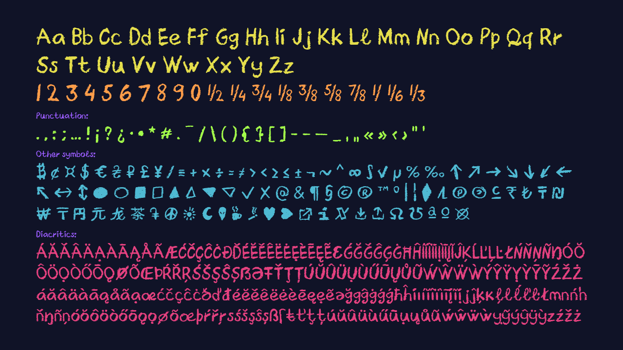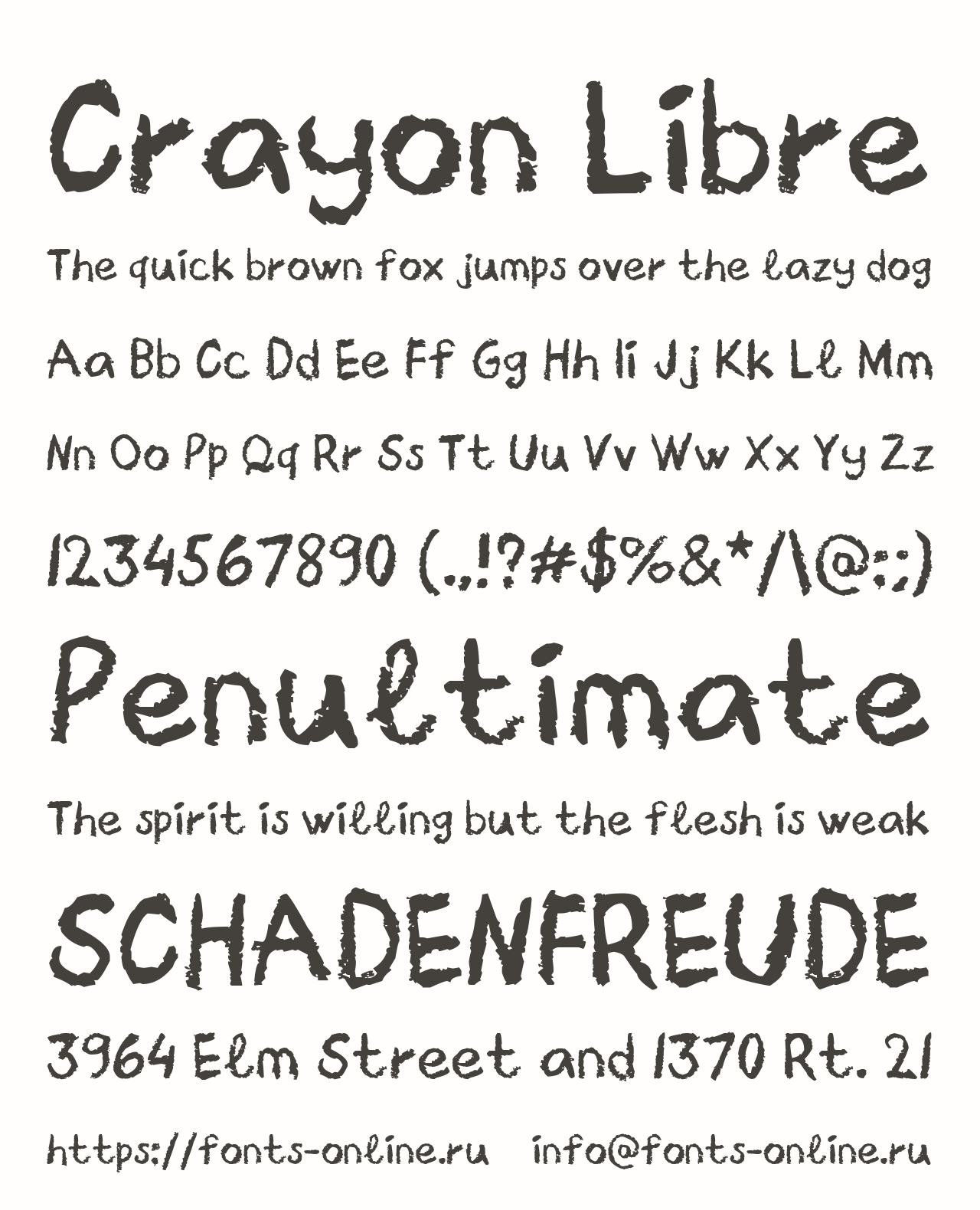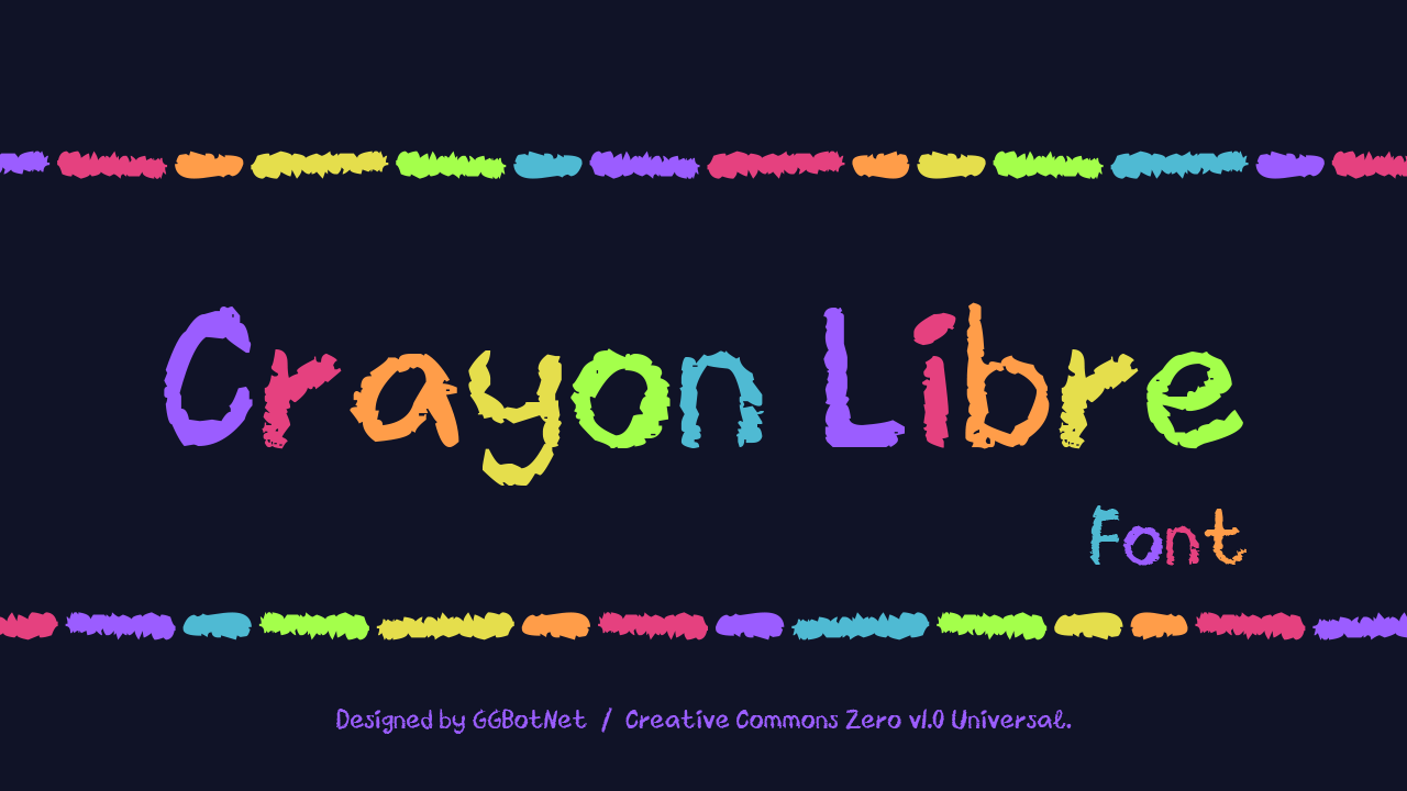 Шрифт Crayon Libre. Гарнитура содержит 2 файла и поддерживает 65 языков. Лицензия CC0 1.0. Можно использовать в коммерческой и не коммерческой деятельности. Разработка Crayon Libre велась GGBotNet.