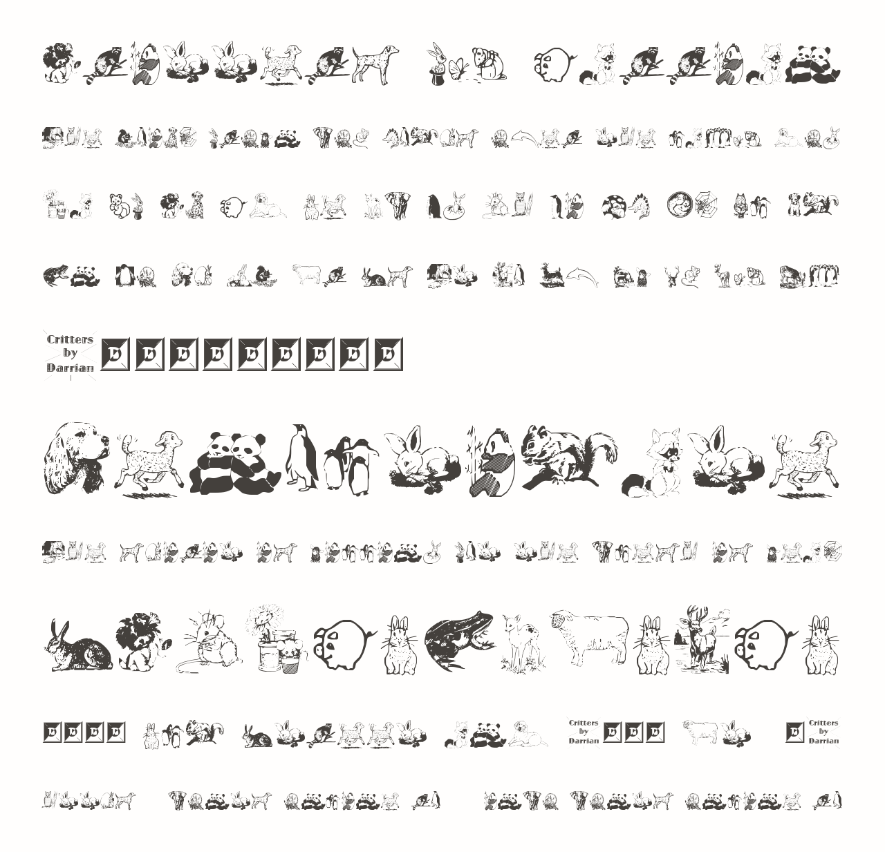 Шрифт Critters by Darrian. Гарнитура содержит 1 файл и поддерживает 12 языков. Можно использовать в коммерческой и не коммерческой деятельности.
