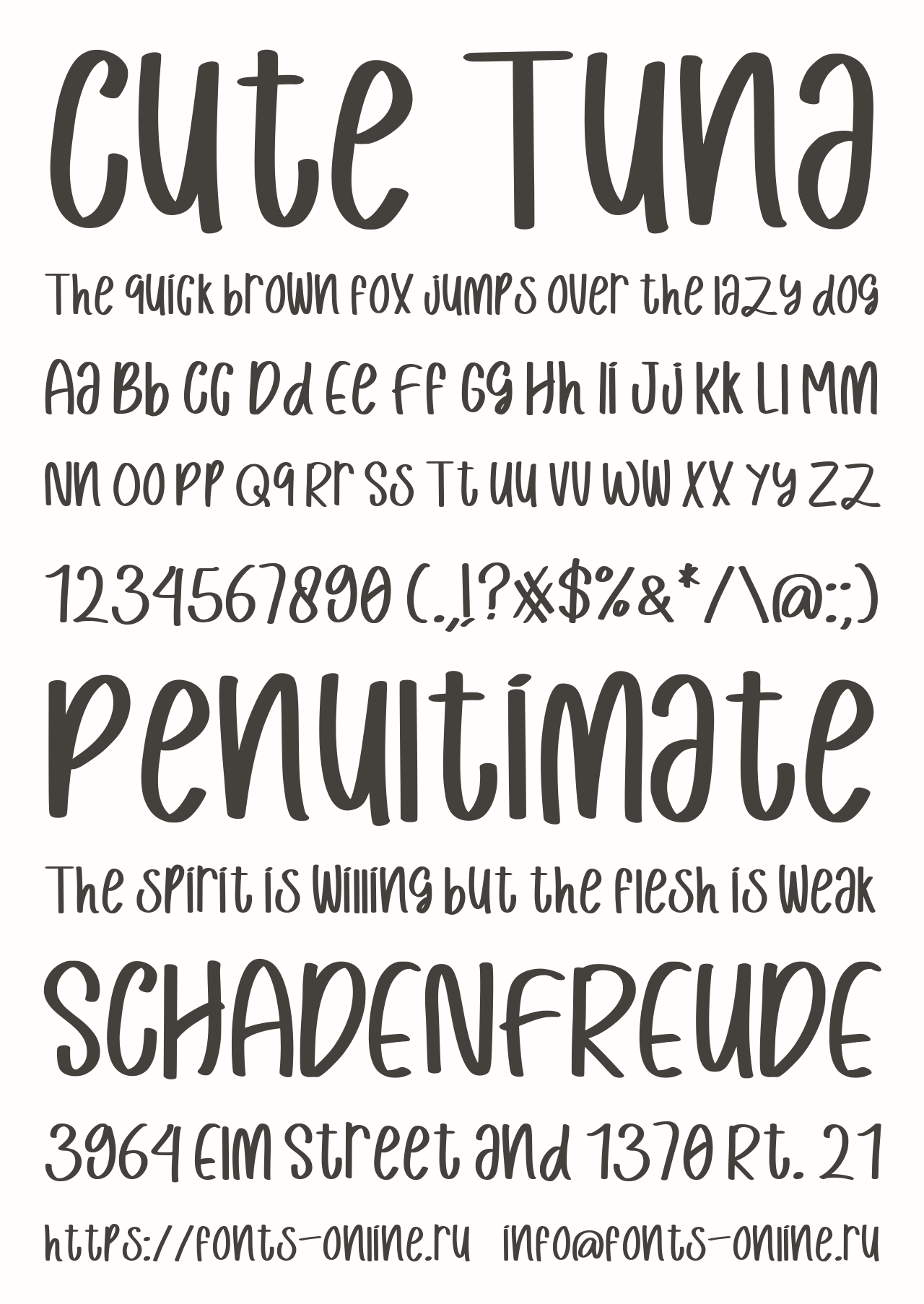 Шрифт Cute Tuna. Гарнитура содержит 2 файла и поддерживает 37 языков. Можно использовать в не коммерческой деятельности. Разработка Cute Tuna велась nomlimofont.