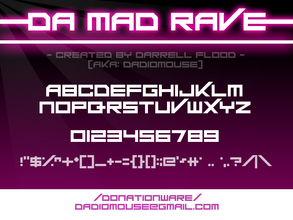 Шрифт Da Mad Rave. Гарнитура содержит 2 файла и поддерживает 12 языков. Разработка Da Mad Rave велась Darrell Flood.