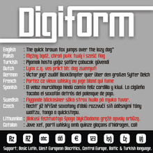 Шрифт Digiform. Гарнитура содержит 1 файл и поддерживает 56 языков. Можно использовать в не коммерческой деятельности. Разработка Digiform велась Studio Typo.