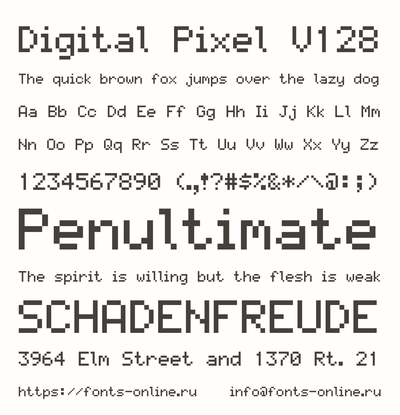 Digital Pixel V128 PinterestFacebookTwitter Скачать Digital Pixel V128 Тестировать Digital Pixel V128 Сообщить об ошибке Шрифт Digital Pixel V128. Гарнитура содержит 1 файл и поддерживает 75 языков. Описание The true final version of Digital Pixel. Copyright Copyright © XYZ Co. Inc. Дополнительная информация Категории Тематические шрифты Пиксельные шрифты Техно шрифты Фантастические шрифты Цифровые шрифты Шрифты без засечек Шрифты для заголовков Шрифты для текста Языки Азербайджанский Акан Албанский Английский Африкаанс Баскский Белорусский Болгарский Боснийский Бретонский Букмол Валлийский Венгерский Волапюк Галисийский Гренландский Греческий Датский Западнофризский Зулу Индонезийский Ирландский Исландский Испанский Итальянский Каталанский Кечуанский Кикуйю Корнский Латышский Лингала Литовский Луба-катанга Луганда Люксембургский Македонский Малагасийский Мальтийский Мэнский Немецкий Нидерландский Новонорвежский Оромо Осетинский Польский Португальский Романшский Руанда Румынский Рунди Русский Санго Северносаамский Северный ндебеле Сербский Словацкий Словенский Сомалийский Суахили Тонганский Турецкий Узбекский Украинский Фарерский Финский Французский Фула Хорватский Чеченский Чешский Шведский Шона Шотландский Эсперанто Эстонский