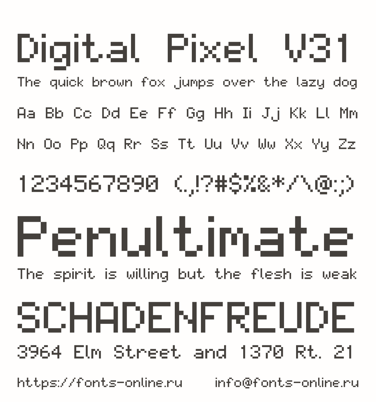 Шрифт Digital Pixel V31. Гарнитура содержит 1 файл и поддерживает 68 языков. Лицензия GNU GPL 3.0. Можно использовать в коммерческой и не коммерческой деятельности.