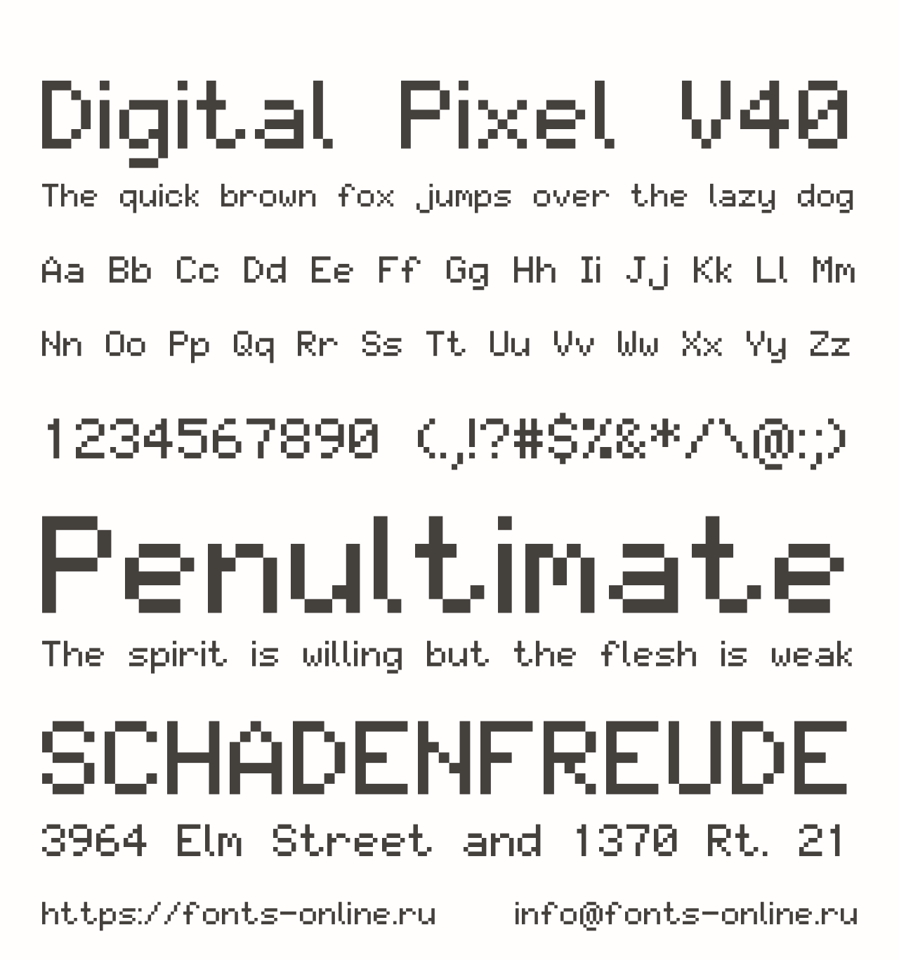 Шрифт Digital Pixel V40. Гарнитура содержит 1 файл и поддерживает 69 языков. Лицензия GNU GPL 3.0. Можно использовать в коммерческой и не коммерческой деятельности.
