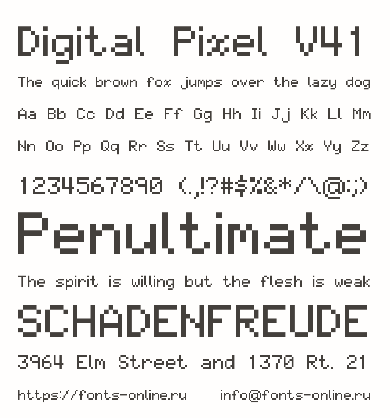 Шрифт Digital Pixel V41. Гарнитура содержит 1 файл и поддерживает 49 языков. Лицензия GNU GPL 3.0. Можно использовать в коммерческой и не коммерческой деятельности.