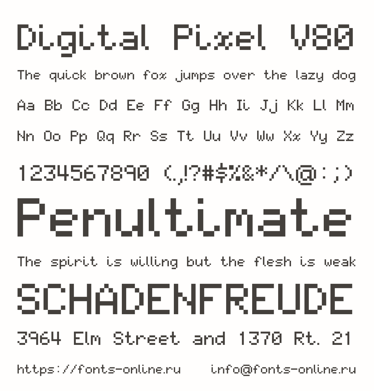 Шрифт Digital Pixel V80. Гарнитура содержит 1 файл и поддерживает 49 языков. Лицензия GNU GPL 3.0. Можно использовать в коммерческой и не коммерческой деятельности.