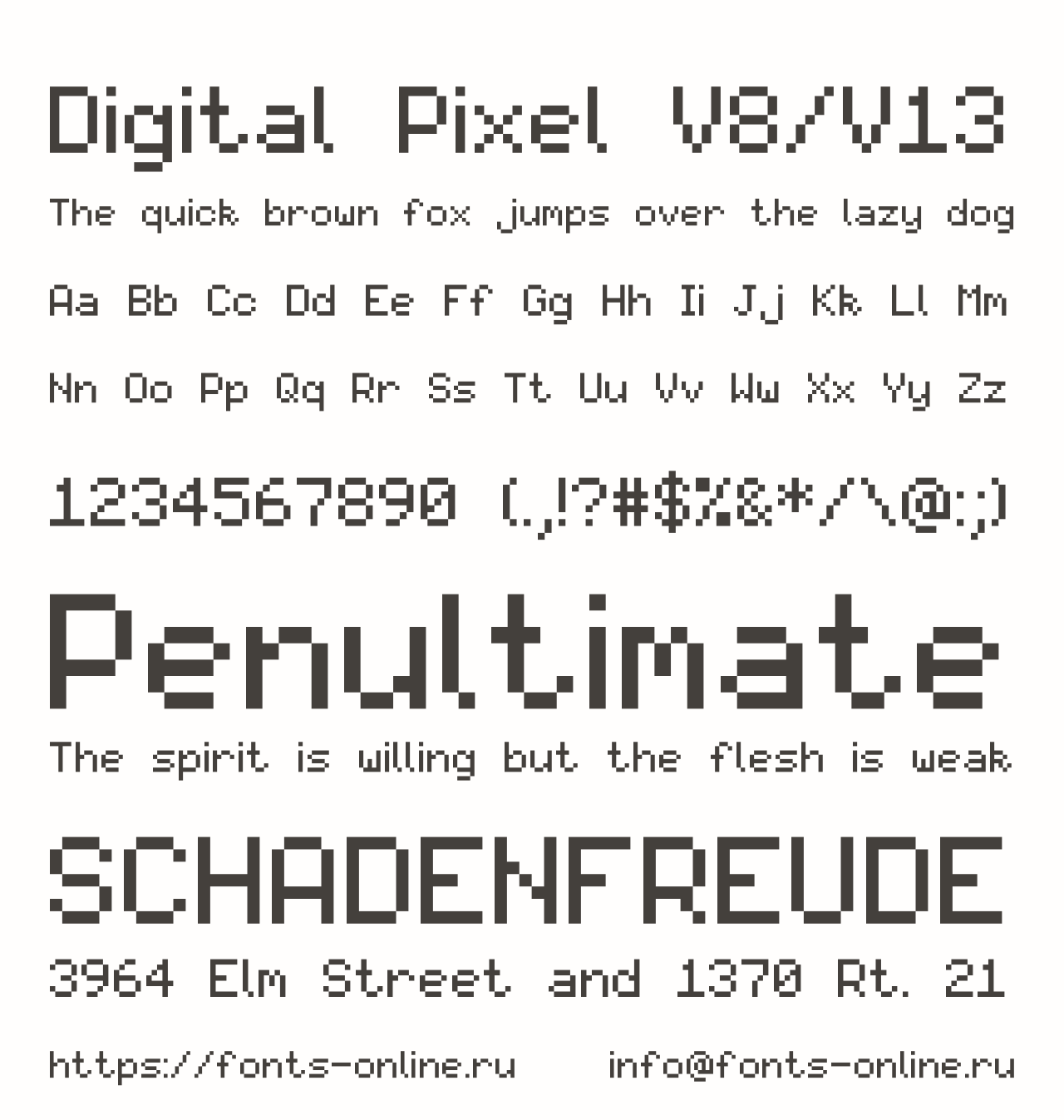 Digital Pixel V8/V13 PinterestFacebookTwitter Скачать Digital Pixel V8/V13 Тестировать Digital Pixel V8/V13 Сообщить об ошибке Шрифт Digital Pixel V8/V13. Гарнитура содержит 1 файл и поддерживает 47 языков. Описание This is the last version of Digital Pixel. Copyright Copyright © CoolrashMarioEXE Дополнительная информация Категории Тематические шрифты Пиксельные шрифты Техно шрифты Компьютерные шрифты Шрифты без засечек Языки Албанский Английский Африкаанс Баскский Бретонский Букмол Волапюк Галисийский Гренландский Греческий Датский Западнофризский Зулу Индонезийский Ирландский Исландский Испанский Итальянский Каталанский Кечуанский Кикуйю Корнский Луганда Люксембургский Малагасийский Мэнский Немецкий Нидерландский Новонорвежский Оромо Португальский Романшский Руанда Рунди Санго Северный ндебеле Словенский Сомалийский Суахили Узбекский Фарерский Финский Французский Шведский Шона Шотландский Эстонский