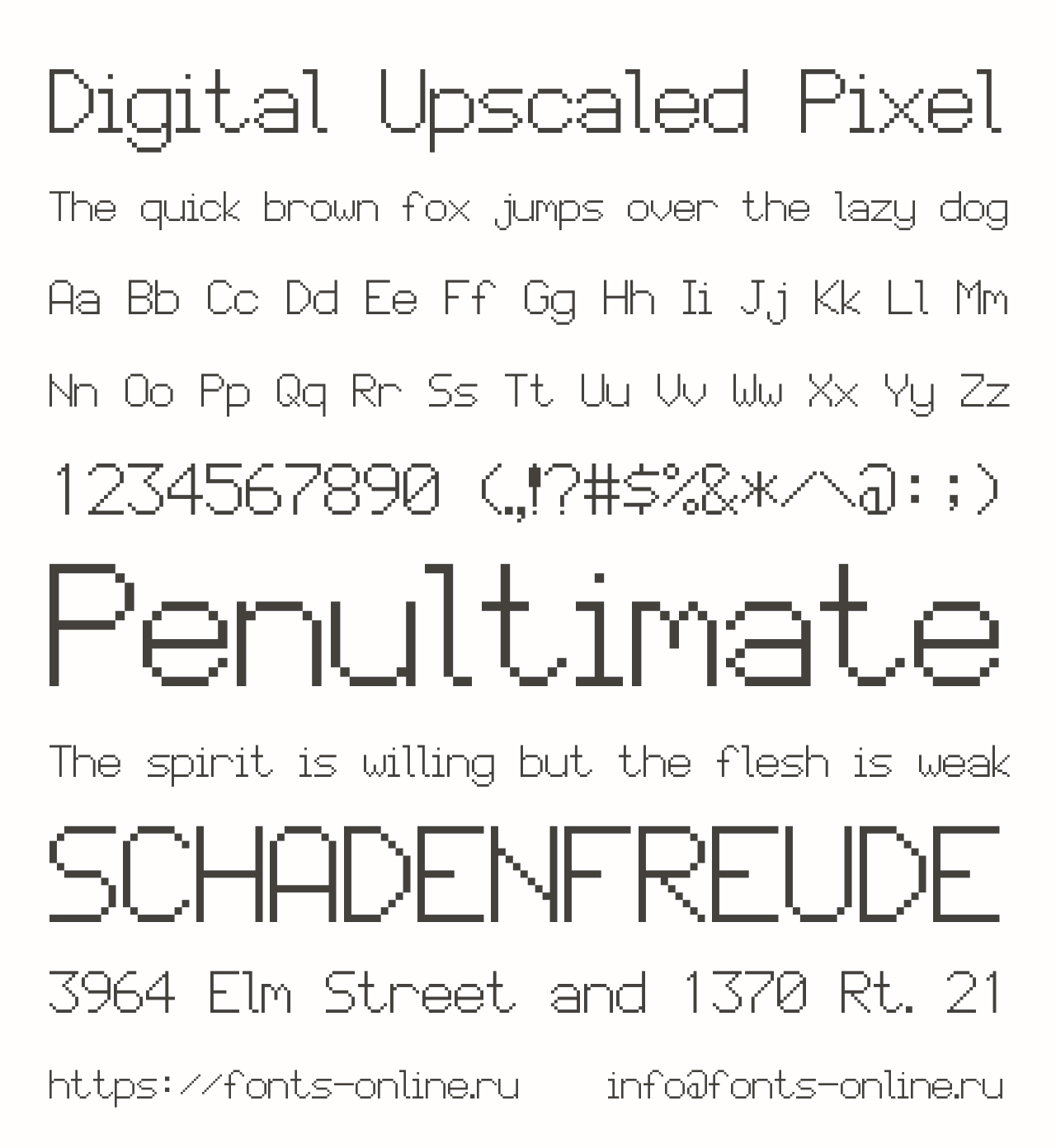 Шрифт Digital Upscaled Pixel. Гарнитура содержит 1 файл и поддерживает 49 языков. Лицензия GNU LGPL 3.0. Можно использовать в коммерческой и не коммерческой деятельности.