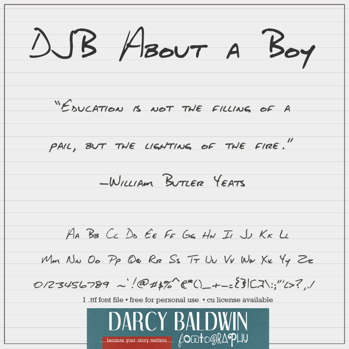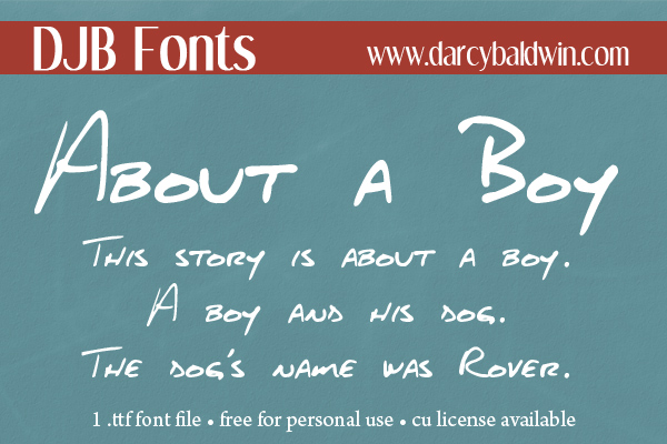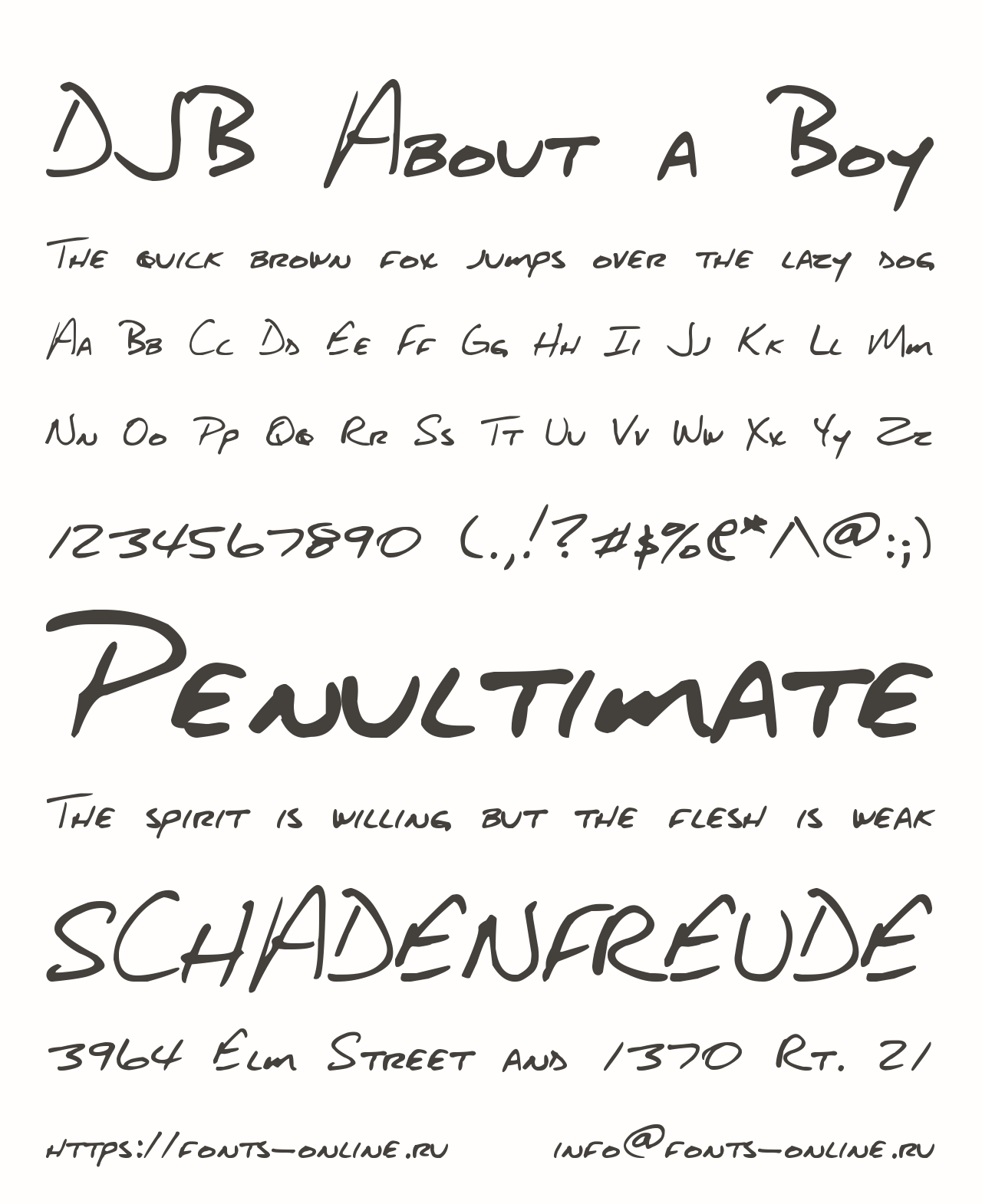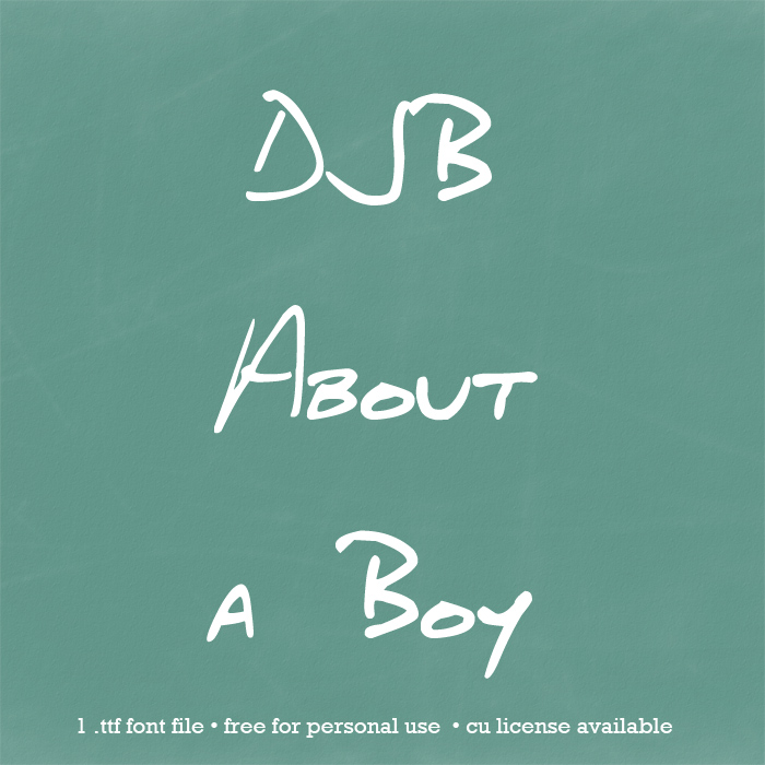 Шрифт DJB About a Boy. Гарнитура содержит 1 файл и поддерживает 37 языков. Можно использовать в не коммерческой деятельности. Разработка DJB About a Boy велась DJB Fonts.