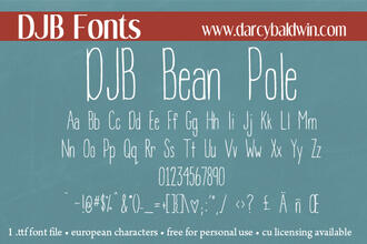 Шрифт DJB BEAN POLE. Гарнитура содержит 1 файл и поддерживает 56 языков. Можно использовать в не коммерческой деятельности. Разработка DJB BEAN POLE велась DJB Fonts.