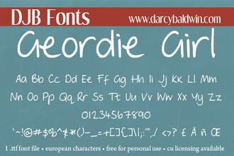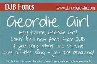 Шрифт DJB Geordie Girl. Гарнитура содержит 1 файл и поддерживает 56 языков. Можно использовать в не коммерческой деятельности. Разработка DJB Geordie Girl велась DJB Fonts.