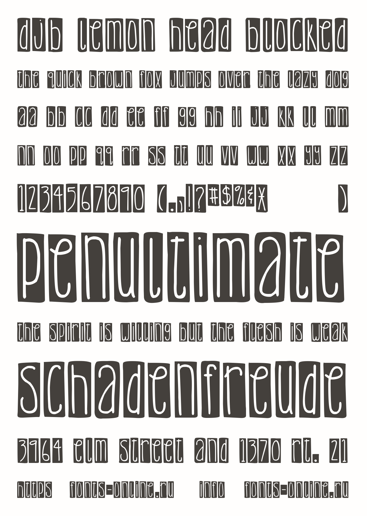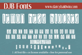 Шрифт DJB Lemon Head Blocked. Гарнитура содержит 1 файл и поддерживает 37 языков. Можно использовать в не коммерческой деятельности. Разработка DJB Lemon Head Blocked велась DJB Fonts.
