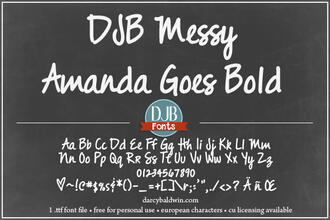 Шрифт DJB Messy Amanda Goes Bold. Гарнитура содержит 1 файл и поддерживает 56 языков. Можно использовать в не коммерческой деятельности. Разработка DJB Messy Amanda Goes Bold велась DJB Fonts.