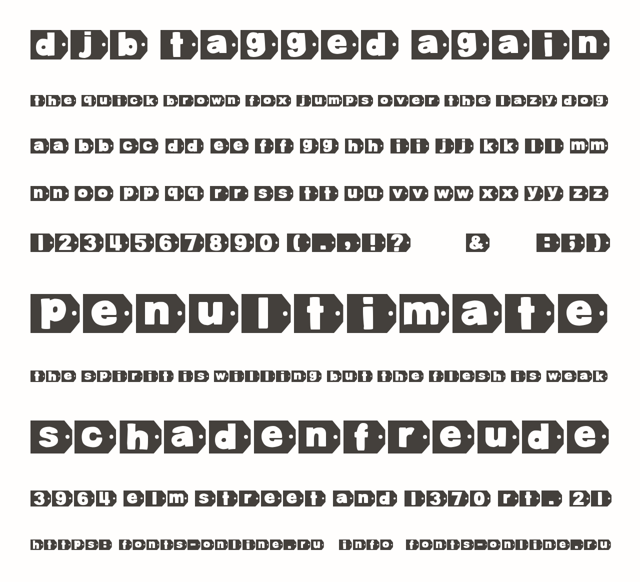 Шрифт DJB Tagged Again. Гарнитура содержит 2 файла и поддерживает 37 языков. Можно использовать в не коммерческой деятельности. Разработка DJB Tagged Again велась DJB Fonts.