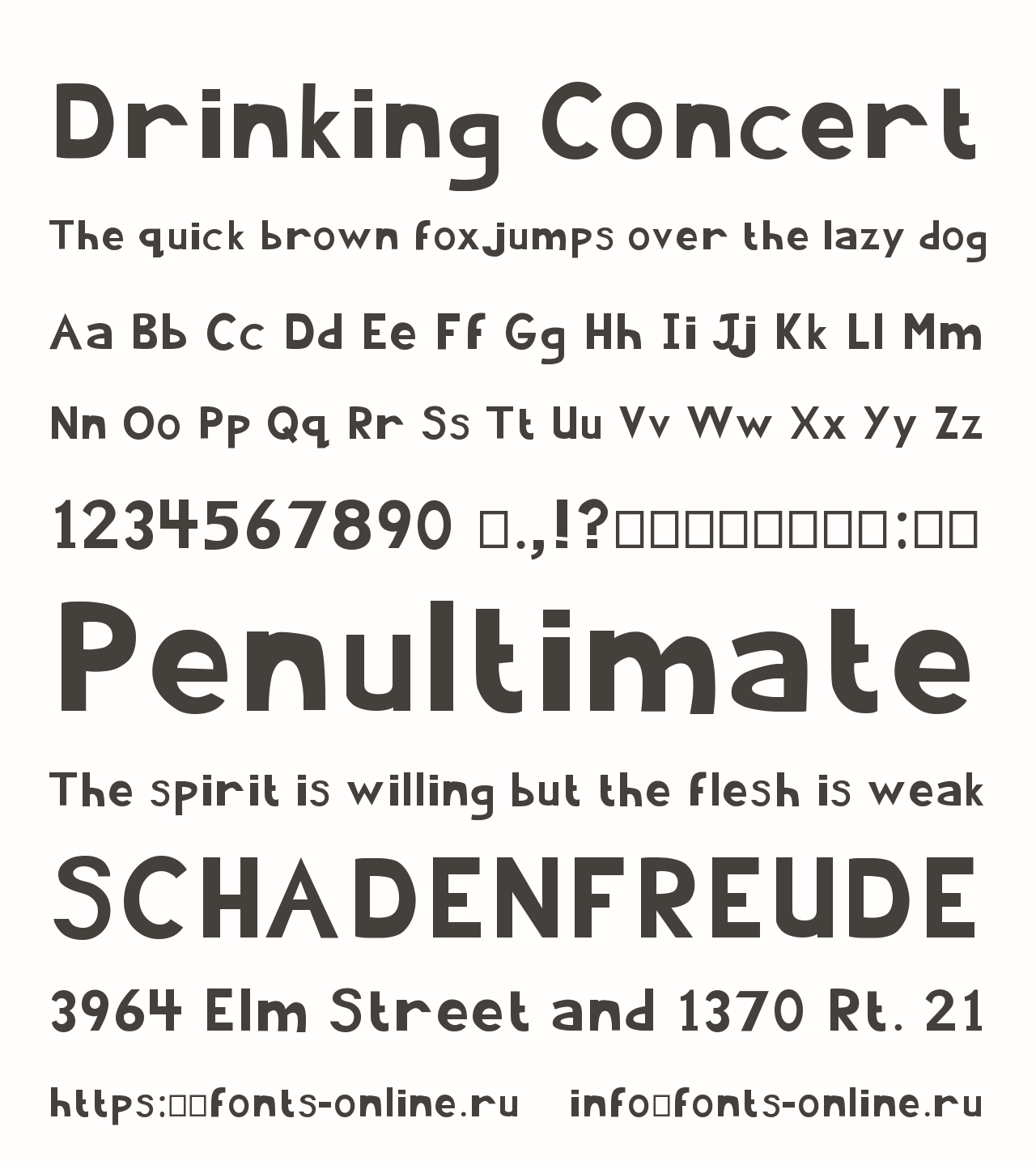 Drinking Concert PinterestFacebookTwitter Скачать Drinking Concert Тестировать Drinking Concert Сообщить об ошибке Шрифт Drinking Concert. Гарнитура содержит 1 файл и поддерживает 12 языков. Описание This font was used in Aprende L' Alphabet video Copyright Anonymous Дополнительная информация Категории Тематические шрифты Искажённые шрифты Комические шрифты Шрифты для комиксов Шрифты из мультфильмов Шрифты для заголовков Языки Английский Зулу Индонезийский Корнский Оромо Руанда Рунди Северный ндебеле Сомалийский Суахили Узбекский Шона
