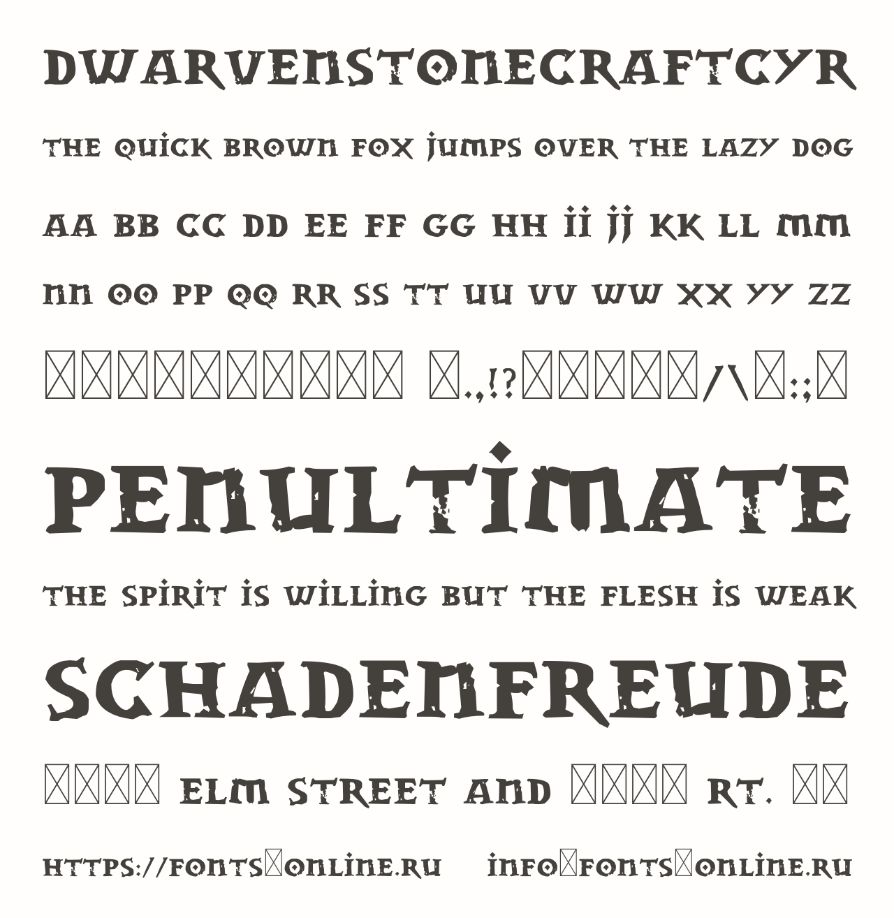 Шрифт DwarvenStonecraftCyr. Гарнитура содержит 1 файл и поддерживает 37 языков. Можно использовать в коммерческой и не коммерческой деятельности. Разработка DwarvenStonecraftCyr велась Ksenia Petova.